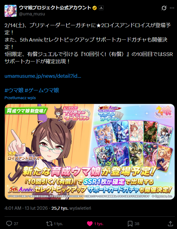 Previous: >>557207260>Global Game NewsLink your account to Cygames iDCurrent Scenario: Aoharu Hai aka "Unity Cup"Current Rate Up Trainee: Sakura Chiyono O (3*)Current Rate Up Support Cards: SSR Sasami Anshinzawa (Pal), SR Tamamo Cross (Guts), SSR Riko Kashimoto (Pal), SSR Tazuna Hayakawa (Pal)Current CM: Capricorn Cup - Chukyo Turf 1200mMain Story Chapter 5 is out01/27 - New Beginnings Part 102/11 - 02/19 - Sakura Chiyono O+Tazuna SSR+Riko SSR Rerun02/13 - 02/19 - Capricorn Cup - Chukyo Turf 1200mhttps://umamusume.com/news/100040/https://pages.snep.pw/uma/anni-skill-changes/>JP Game NewsCurrent Rate Up: Valentine Taiki Shuttle (3*), Valentine Sounds of Earth (3*), SSR Matikanefukukitaru, SSR Neo UniverseNew Scenario "Yukoma Hot Spring" releasedTimeline: https://uma.moe/timelineCygames Webstore: https://webstore.cygames.com/en/umamusume_en/>Thread Clubshttps://rentry.co/umaglobalclublistYou must be E3 (20k points) to join a circle. Apply with /uma/ or /vg/ in your profile or post ID in the thread.>All Guides & Resourceshttps://rentry.org/uma26Game databasehttps://gametora.com/umamusume (Click the gear to switch between JP / global server info)A basic guide for newfagshttps://rentry.org/umaglobalFind networks if your region is blocked from the game or clienthttps://www.umavpn.top/93Seiyuu & Concertshttps://rentry.org/umstUma Texthttps://umareader.idsmile.xyz/