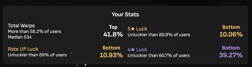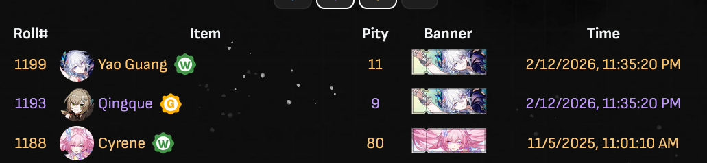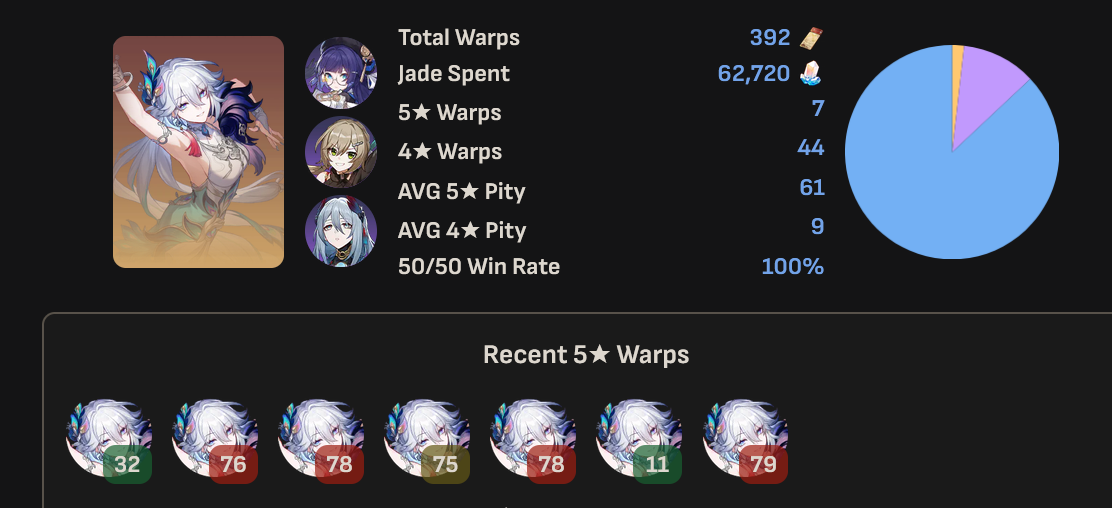 Went all the way to 80 and lost the 50/50 to E7 Himeko.Got her in the next 40 roll.Went all the way to 70 rolls to get her weapon.I feel like I have had such fucking bad luck in this game with 50/50s and early hits.Either way, she's fully built now.100 rolls left for Sporkle Pro Max+ next patch.
