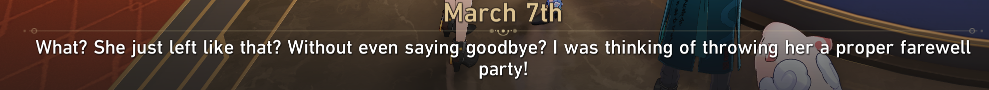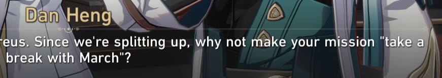 >>557249831>Sunday: She gonna be fine she always makes it out>Dan: I Hope GoR doesn't know about what took place in Ampho>March: I hope the path ahead of her is brighter ( or some shit ) >Himeko: Let's look forward to a day we will reunite with her.>Welt <<< I didn't check him...Not Gonna lie if it wouldn't be HSR I would say that Swan gonna die to that crazy sister from Eden.