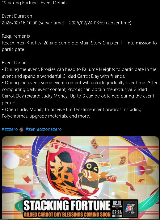 Previous: >>557168932>NewsVersion 2.6 "Encore for an Old Dream" Special Programhttps://youtu.be/oTRy9pZ4TYEAgent Record | Ariahttps://www.hoyolab.com/article/43039871Agent Record | Sunnahttps://www.hoyolab.com/article/43037944>Newest Trailer/Teaser/Character demohttps://youtu.be/0DmndMnuh5E (EN)https://youtu.be/TJXSiIESLyc (JP)https://youtu.be/06G8YgOrXTw (EN)https://youtu.be/FJ0HD6RC6PY (JP)>Upcoming Events for 2.6https://zenless.hoyoverse.com/en-us/news/162561A Harmony of Delusions 02/05 - 03/23Angel's Invitation 02/05 - 04/15Delusion Special 02/05 - 03/23Potential Hypothesis: Frosted Feathers 02/05 - 03/23Livestream for Fluttering Wings 02/05 - 03/23Gilded Surprise, Wonderful Boo-ns 02/14 - 02/25Stacking Fortune 02/16 - 02/24Advanced Bounty: Area Patrol 02/25 - 03/02Gravitational Storytime 03/04 - 03/23"En-Nah" Cheersquad Gift 03/04 - 03/23Snap! Hollow Real Showdown 03/09 - 03/23High Score Card Collector 03/16 - 03/23>Redeemable codes (claimable in-game or online)https://zenless.hoyoverse.com/redemptionZENLESSGIFTZZZ25MINAZHAOISFREEShunguangWinterGiftZZZ20265OZ2HDP95IZZZANGELSZZZ26DELUSIONAODDEBUTZZZAOD0206ZZZCREATOR26>Resources and useful linkshttps://rentry.org/zzzlinkshttps://rentry.org/ZZZ-Friendshttps://rentry.org/ZZZ-Guilds>/zzz/ OP pastebin (use this if making new thread):https://pastebin.com/PzbMf13P