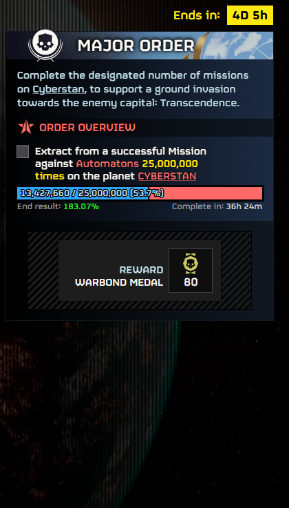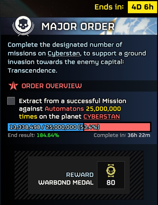 >>557246186You're not supposed to be liberating them.You're supposed to be bugdiving for the MO. Cyberstan's megafactories have 4% resistance which would require about 90% of the player base on one city to liberate it.This is Joel's obtusely Swigger way of saying to bugdive for the bug culling Major Order to acquire more reserves for the Cyberstan MO which still has 5 whole days left.When the bug culling MO is completed and we gain more reserves, I predict he will lower the resistance on Cyberstan's megafactories and graciously allow us to begin liberating them.Always remember that you are only allowed to do what Joel wants you to do, when he wants you to do it.