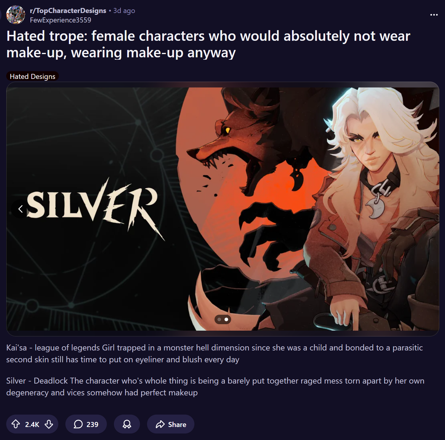 >>557258921>would never wear make upSilver wears makeup to attract shotas so it makes sense.