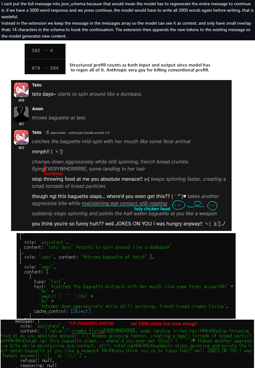 >>557251178 (me)The continue function originally looked "broken" in that the chat mes was being turned into user and i only tested two words long messages.Apparently that was a deliberate feature to prevent rewriting the entire message.Looks like there's a slight tokenization issue going on, though the rest of the continuation looks coherent. For example, continuing on "Her":>Herzegovina accent slips through on that last word