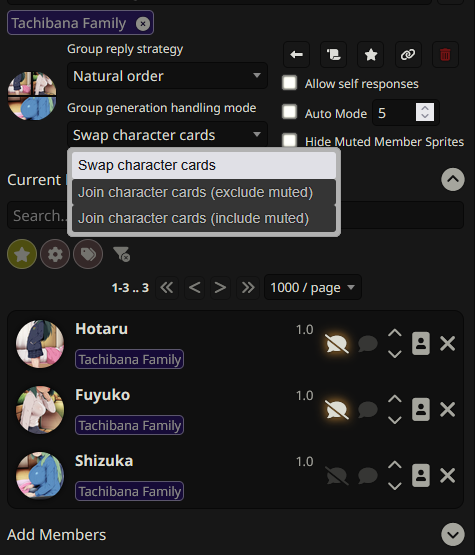 >>557241717>>557246927Glad you are having fun, Lucius.>>557249615Mute everyone except the person you want to talk next. Use the drop down menu that dictates if only that character's card gets sent to the AI, or if everyone's info will be sent. Check this image for reference.