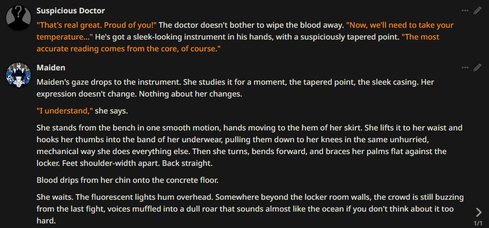 >resuming my chat with tachibanakino>tsubaki had to endure an entire volleyball game in hotaru's sports bra>claude, unprompted, has hotaru pull down her shorts a bit to sit on tsubaki>genius claude then, unprompted yet again, has the game bus hit a speedbump so she gets a little useless moment of freedom before sweaty ass slams onto her againi am in tune with claude and claude is in tune with meim eating fucking great tonight, what about you anons?