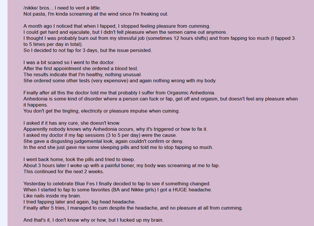 I wish I didn’t beat my dick to e-girls so much in the past because im too dead inside to find velvet attractive anymore, like i can see her appeal but like i said, my dick is actually just DEAD bro, like it feels numb and pathetic. I spent not very much on the game and just mostly grind for stats and I just don’t know what to do. All those e-girls and hookers I paid for just ruined my ability to get excited for 2D or something.