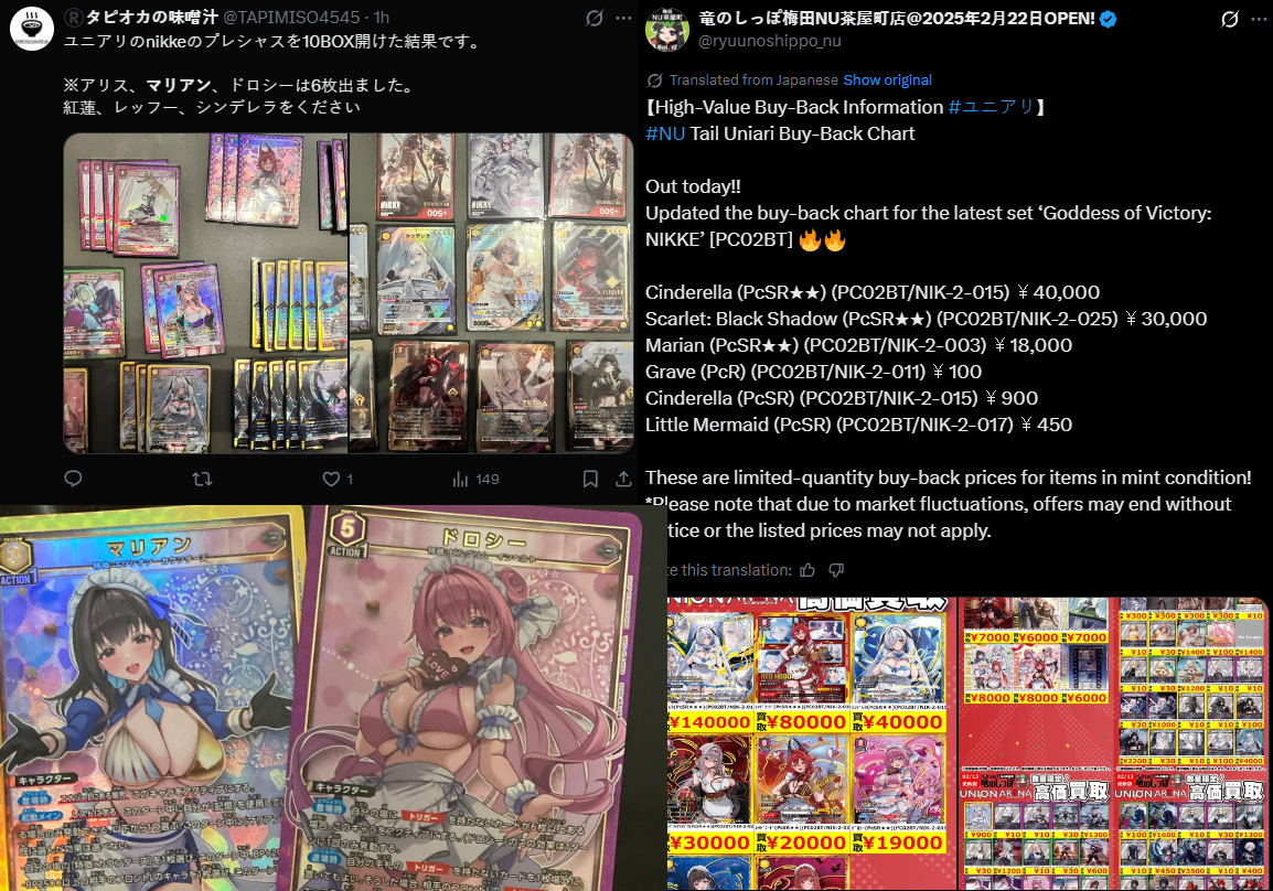 >>557257975nikke released a trading card box set or something like that and these are the prices to buy the good rare cardsi dont think anyone actually gives a fuck about meta in a nikke trading card game so it's based on the price people will pay for their waifuI want the Babu card