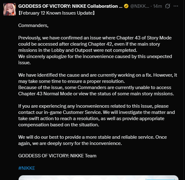 >Game Download - Android/iOS/PChttps://nikke-en.com/index.html>General Info/FAQ for New Playershttps://rentry.org/NikkeInfo>Additional Linkshttps://rentry.org/nikghomeALL DATES/TIMES LISTED BELOW ARE UTC+9 (KOREA TIME)>Update on February 12https://nikke-en.com/newsdetail.html?col_name=&sid=&content_id=4fb0d316a02f2a4c62a89cfaddc22ca30853>Developer's Note: January 2025https://nikke-en.com/newsdetail.html?content_id=4e97e053a5501a40a3ab73ca13978b6f65da>Current EventsLycoris Recoil Collab - February 12 ~ March 12>Upcoming Events->Current Special RecruitsChisato Nishikigi - February 12 ~ March 12>Upcoming Special RecruitsTakina Inoue - February 19 ~ March 12>Current Costume PassesVelvet: Sensual Rabbit [Mission Pass] - February 1 ~ February 28Chisato Nishikigi: Red Spark Guitar [Mission Pass] - February 12 ~ March 12Mast Romantic Maid: Tea Service [Costume Gacha] - February 12 ~ March 12>Upcoming Costume PassesTakina Inoue: Blue Pulse Bass [Mission Pass] - February 19 ~ March 12>CodesMILLIONCOMMANDERSPrevious: >>557228665