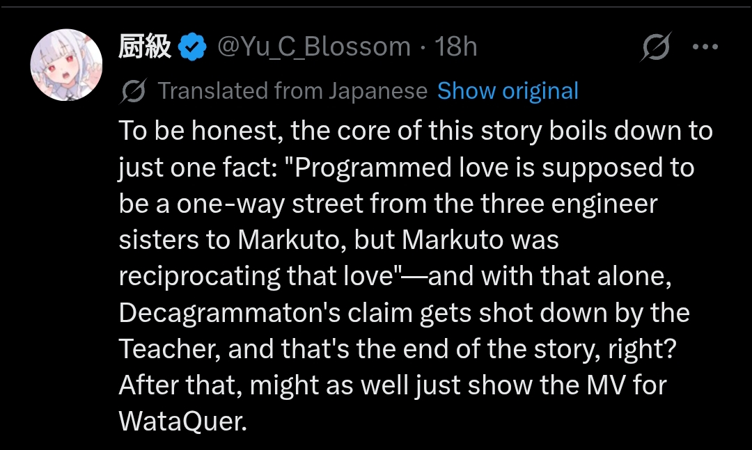 >>557263589>https://x.com/AkakusaTuyuse/status/2021934059887394967They're funny bunch>>557263602Stop trusting spoilerfags, 97% of them aren't even real jpfags.>>557263819Why do we even need to care about these "disgruntled anons"