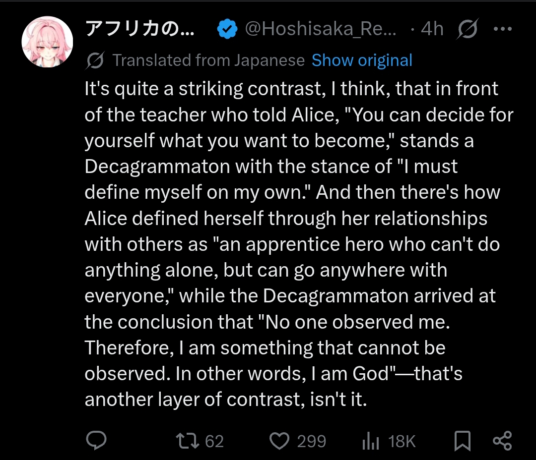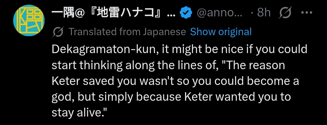 It's kinda funny that Kether saved Deca back then, I thought he just planned to have Malkuth lead the prophets to prosperity, but fucking Kether is responsible for half of the shit we went through just now