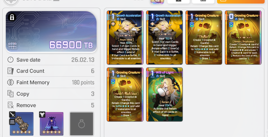 >>557267437>which one matches the skill description?This question doesn't really matter. The fact is that half the shit in this game doesn't match the description either because the translation is fucked or because the card is fucked. People test shit out, and they see how it works, and they assume the description is supposed to match it - and usually, the description gets updated to match how the card has been working. Alcea might be the only instance in the entire game where the card's mechanic was nerfed to "match" the description, rather than the card's translation being "fixed" to match what was actually mechanically happening within the game.