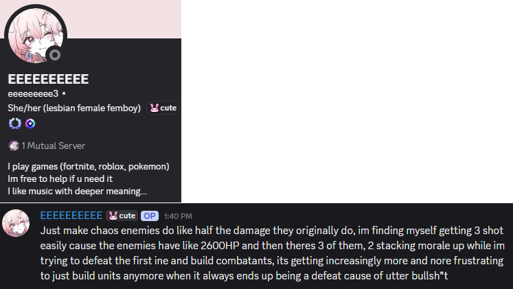>“it wasn’t a nerf, it was a fix since that's what the description says"AND HOW ARE WE SUPPOSED TO KNOW THAT YOU FUCKING GRIFTERSWhen seeing if a new unit/partner is worth to roll, do you expected me to pull up 5 spreadsheets and a calculator and do the math?NO, I actually play the fucking game, try out the Partner in seasonal Chaos for free and see that Alcea mogs the fuck out of Wilheimia, which made me pull