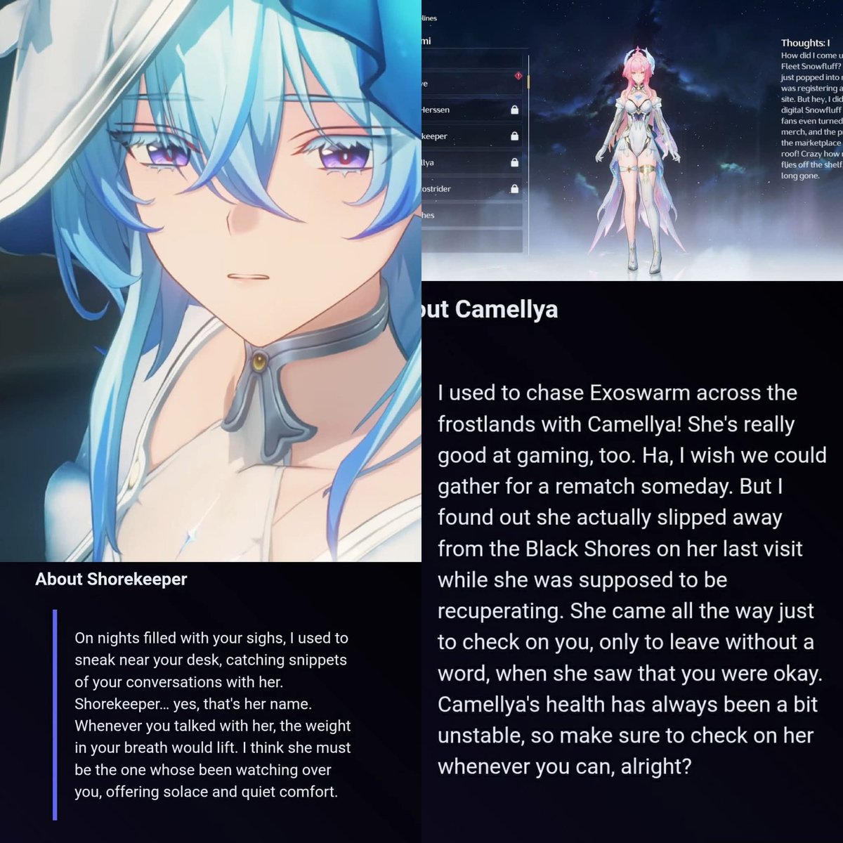 >>557303338>>557302998I love cammy to death but lets not delude ourselves, rover never showed any emotions towards anyone pre 2.5, not even shorekeeper. Rover only showed emotions during phrolova's (seething hatred) and amy's (love and affection)