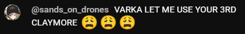 what the fuck are wrong with kids now a days? i dont think we were this fucking horny back then. spamming shit like "i'm cuming for varka" and "i want to ride varka 3rd claymore"