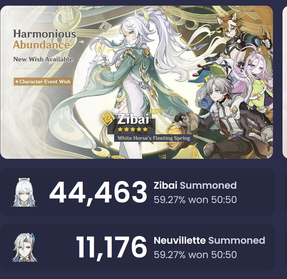 >Current character banner: Zibai, Neuvillette, Illuga, Aino, Gorou