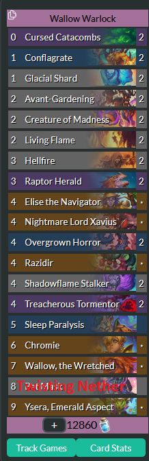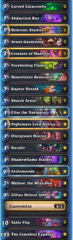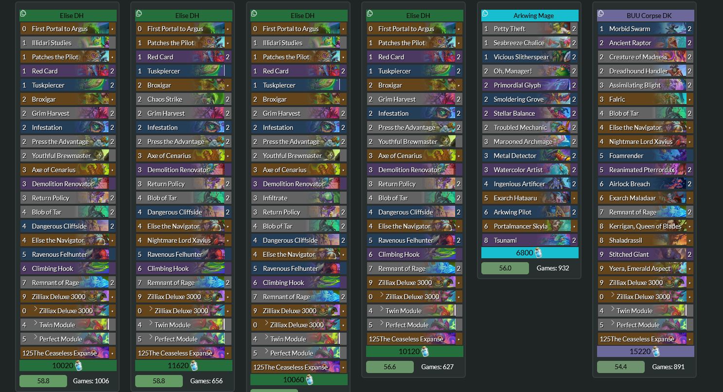 >>557334012from rank 5 to rank 3 I used mostly maestra rogue, then I kept getting matched against aggro decks so I switched to this### corpse# Class: Death Knight# Format: Standard# Year of the Raptor## 2x (1) Morbid Swarm# 2x (2) Creature of Madness# 2x (2) Dreadhound Handler# 2x (2) Infested Breath# 2x (3) Assimilating Blight# 1x (3) Falric# 2x (4) Blob of Tar# 1x (4) Elise the Navigator# 1x (4) Nightmare Lord Xavius# 1x (5) Foamrender# 2x (5) Reanimated Pterrordax# 2x (6) Airlock Breach# 1x (6) Exarch Maladaar# 2x (6) Shadows of Yesterday# 1x (7) Naralex, Herald of the Flights# 1x (8) Kerrigan, Queen of Blades# 2x (9) Stitched Giant# 1x (9) Ysera, Emerald Aspect# 1x (0) Zilliax Deluxe 3000# 1x (0) Zilliax Deluxe 3000# 1x (4) Twin Module# 1x (5) Perfect Module# 1x (10) Fyrakk the Blazing# AAECAeimBgrHpAaouAbC6AbO8Qap9QahgQfDgwesiAeCmAftnwcKmIEF/7oGoOIG3esGtfoGgf0Gl4IHupUHh5wH0q0HAAED9bMGx6QG97MGx6QG7t4Gx6QGAAA=# pretty straight foward list, always mulligan for early game because you're built to beat aggro, any greedier deck will likely beat your ass so just accept it and keep farming aggro players