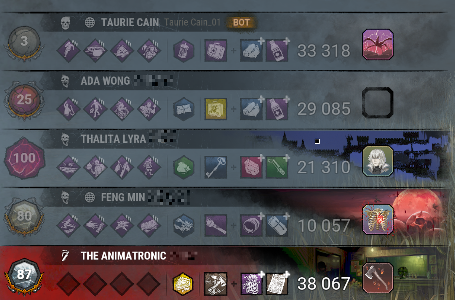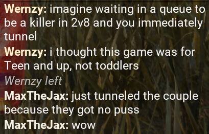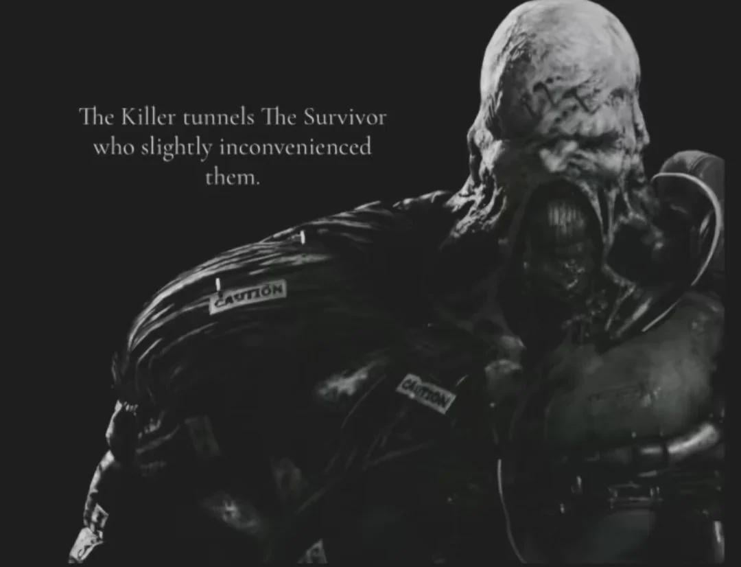 >last one alive is a bot>killers actually keep downing him and letting him him revive to draw it out as long as possible and try and exert the remaining caged survivors into using forfeitthis isn't a 'ugh killer mains!' post it's just an unusually high amount of dead by daylight players across the board are so fucking spiteful and unpleasant