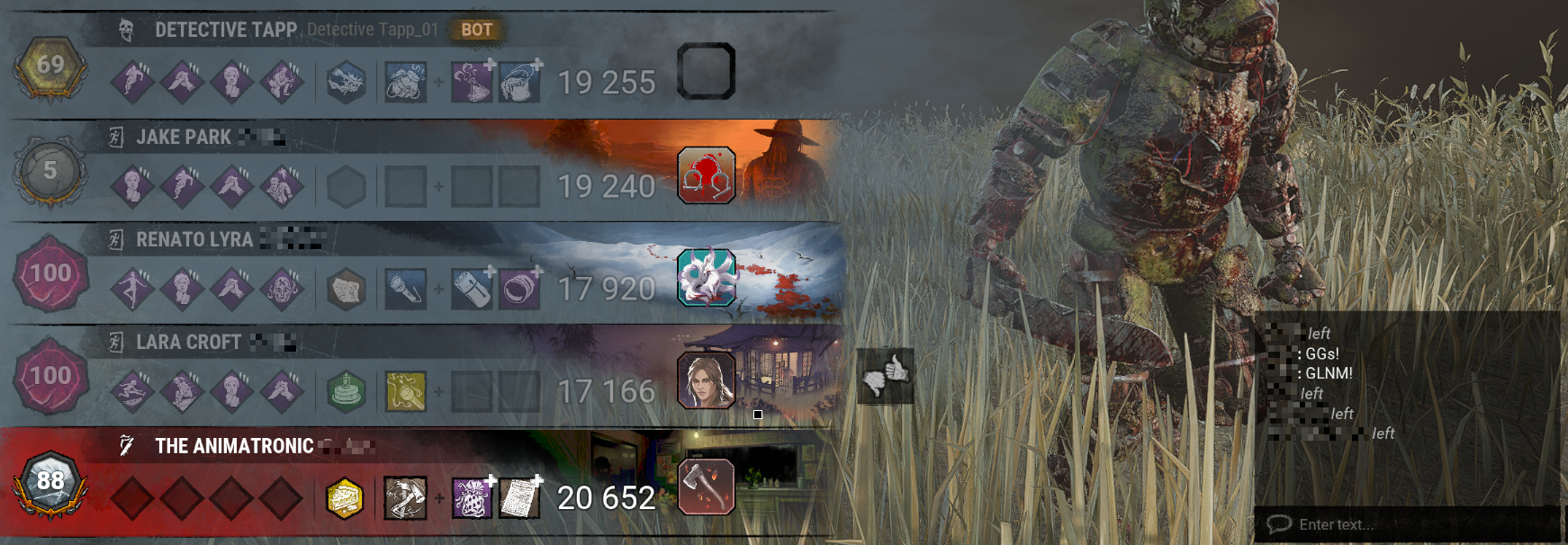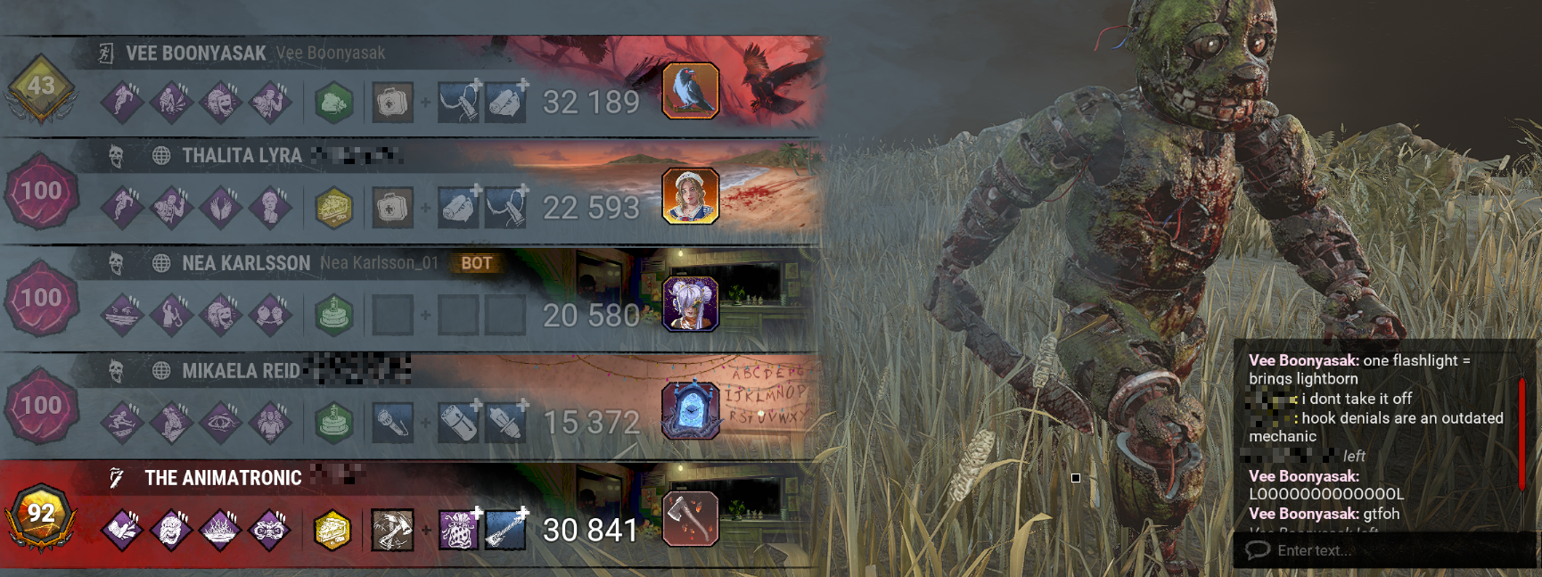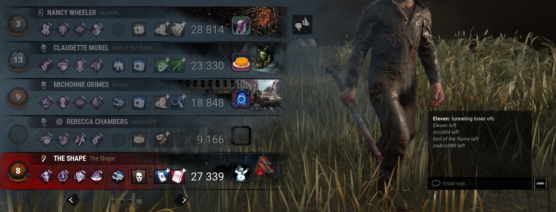 >go 2v8 as deathslinger>my shots just keep going right through survivors, straight on, they don't even bother dodging>random flash lights keep popping off and blinding me without making drop sounds>howevery blight is doing fine>can't tell if I'm correctly seeing that I'm being cheated or if I'm having delusions and coping>pressured by the blight carrying>the few legit misses (I think) that I made were all when the blight was nearby and saw them>about 90% of the sacrifice wheel are his pick-ups by the end and like 2 of the segments are mine>we still killed 3 or 4 of them by the end all thanks to him>can feel him judging me>literally half close my eyes so that I can't see the chat properly during the post-game but can find and press the leave lobby buttonit was the fucking dustin I just know it he was always too cocky during chase, he knew every time my shots just went through him, he knew it was happening