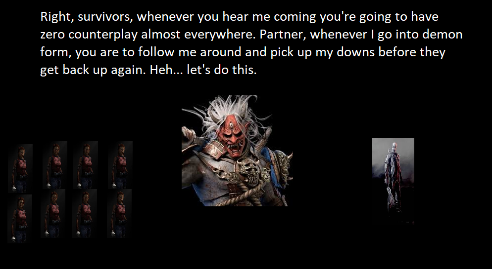 Give some ideas for reworking killers for 2v8.Onryo:>When a survivor is fully condemned, they are exposed and have their aura revealed to both killers, but not moriable>When emerging from a TV gain haste 2x as strong as bloody fingernails>If your teammate is near a TV when you emerge from it, they gain the same haste bonusSingularity:>There is a pod permanently attached to your teammate, which you can look through and tag survivors through>When teleporting near your teammate, they gain overclocked mode.