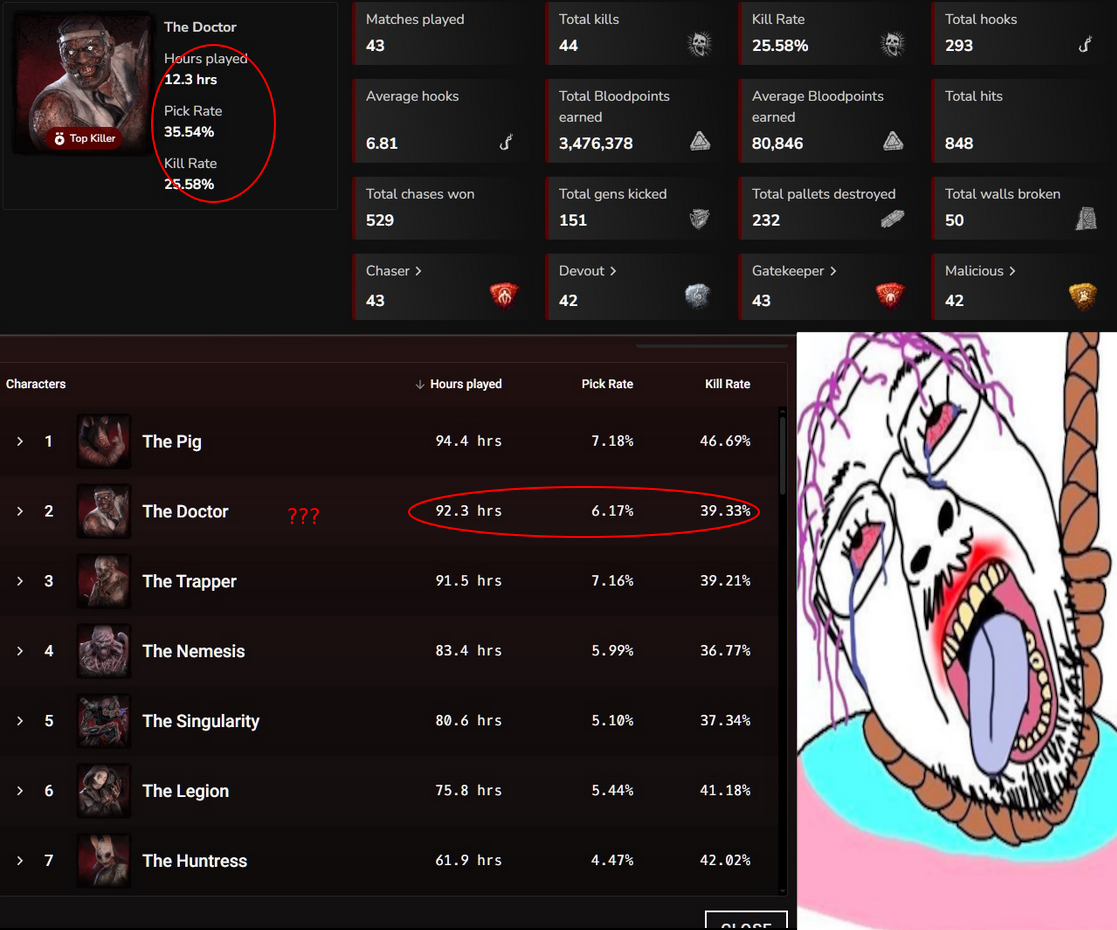 >>557309138next someone will tell me four regression perks would matter>>557309272Perks make no difference. Either way you are relying on survivor mistakes, and time bought by perks is irrelevant because survivors can play slower and more carefully than killer can. Say four perks added two seconds to the match, it would not matter.