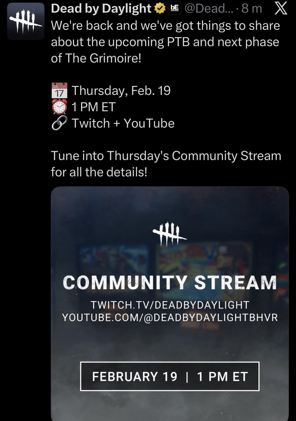 Tunneling editionWhat is Dead By Daylight?Dead By Daylight is an asymmetrical multiplayer (1v4) horror-styled game where one player takes on the role of the Killer and four players take on the role of Survivors. The Survivors' objective is to repair generators in order to power and open exit gates to escape. The Killer's objective is to kill the Survivors.▶ NEWS>first look at new Grimoire killer: https://x.com/DeadbyDaylight/status/2021691210612854911>9.4.2 bugfixes, including nurse blinks: https://forums.bhvr.com/dead-by-daylight/kb/articles/536-9-4-2-bugfix-patch>Official Stat Tracker Websitehttps://stats.deadbydaylight.com/▶ RESOURCES & INFORMATION>Official website:https://www.deadbydaylight.com>Patch Notes:https://forums.bhvr.com/dead-by-daylight/kb/patchnotes>Wiki:https://deadbydaylight.wiki.gg/Previous strategy: >>556725498