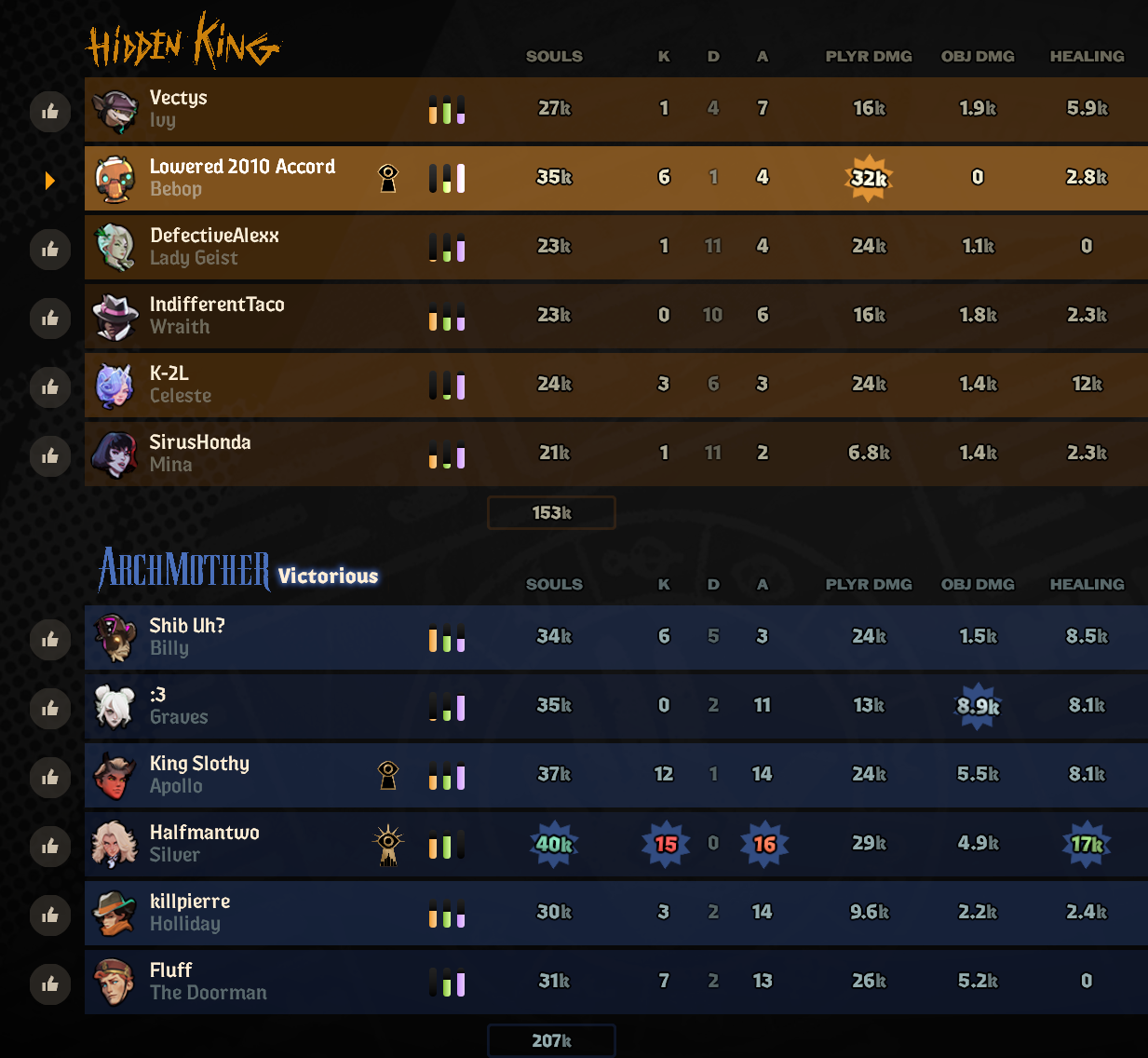 I think I've nailed down why Silver is so trash.Silver's kit feels like the kit of an overwatch character, not a moba character.Moba character kits need to actually give you tools that enable you to achieve the things the hero wants/needs to do. Tanky characters need built in stuff that gives them tankyness, artillery characters need built in damage amps, supports need built in utility, assassins/divers need built in isolation and burst. Silver meanwhile has a kit that has nothing to do with moba design. Her kit feels like an overwatch kit where she has some abilities that do shit but she has NOTHING in her kit to enable her being a bruiser (the role she seems to have been made with in mind). She just has some combos built into her kit, going 3-2-1 and hopefully having wolf form after that and a couple of melees, but there is nothing in her kit to make her survive doing that right in the enemy's face without getting instantly blow up. No actual survivability, no hard CC, no displacements, the game just expects you to be a bruiser without literally anything that all the other characters in this game have.
