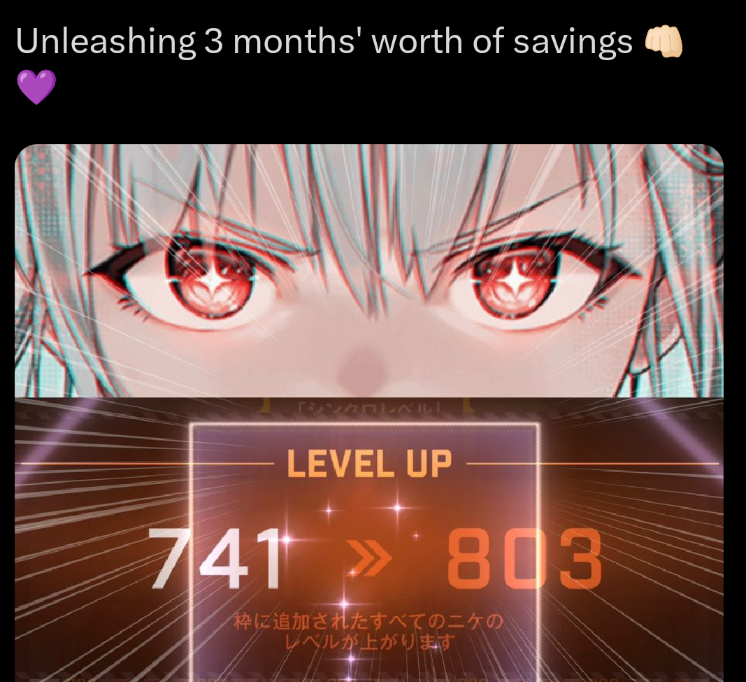 >>557340364Congratulations, anon!There is still one more trial ahead of you, the top of the sync room. If you're planning on getting 3 more copies her to permanently lock her position as one of your first 5 Nikkes to reach level 200 with, then you may be stuck at level 160 for a while longer than you planned to be.