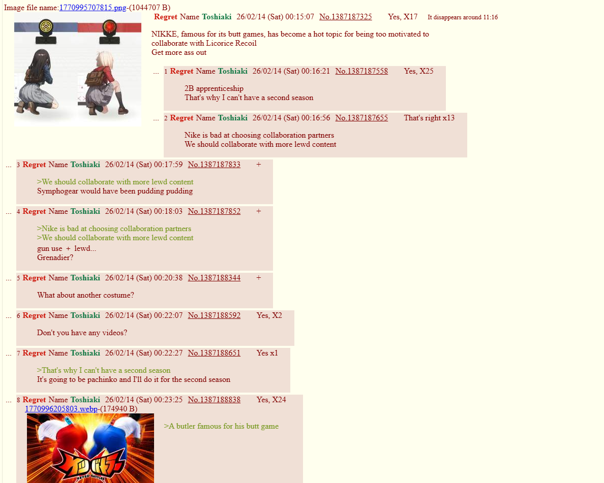 Hag General >Game Download - Android/iOS/PC https://nikke-en.com/index.html >General Info/FAQ for New Players https://rentry.org/NikkeInfo >Additional Links https://rentry.org/nikghome ALL DATES/TIMES LISTED BELOW ARE UTC+9 (KOREA TIME) >Update on February 12 https://nikke-en.com/newsdetail.html?col_name=&sid=&content_id=4fb0d316a02f2a4c62a89cfaddc22ca30853 >Developer's Note: January 2025 https://nikke-en.com/newsdetail.html?content_id=4e97e053a5501a40a3ab73ca13978b6f65da >Current Events Lycoris Recoil Collab - February 12 ~ March 12 >Upcoming Events - >Current Special Recruits Chisato Nishikigi - February 12 ~ March 12 >Upcoming Special Recruits Takina Inoue - February 19 ~ March 12 >Current Costume Passes Velvet: Sensual Rabbit [Mission Pass] - February 1 ~ February 28 Chisato Nishikigi: Red Spark Guitar [Mission Pass] - February 12 ~ March 12 Mast Romantic Maid: Tea Service [Costume Gacha] - February 12 ~ March 12 >Upcoming Costume Passes Takina Inoue: Blue Pulse Bass [Mission Pass] - February 19 ~ March 12 >Codes MILLIONCOMMANDERS Previous: >>557289204