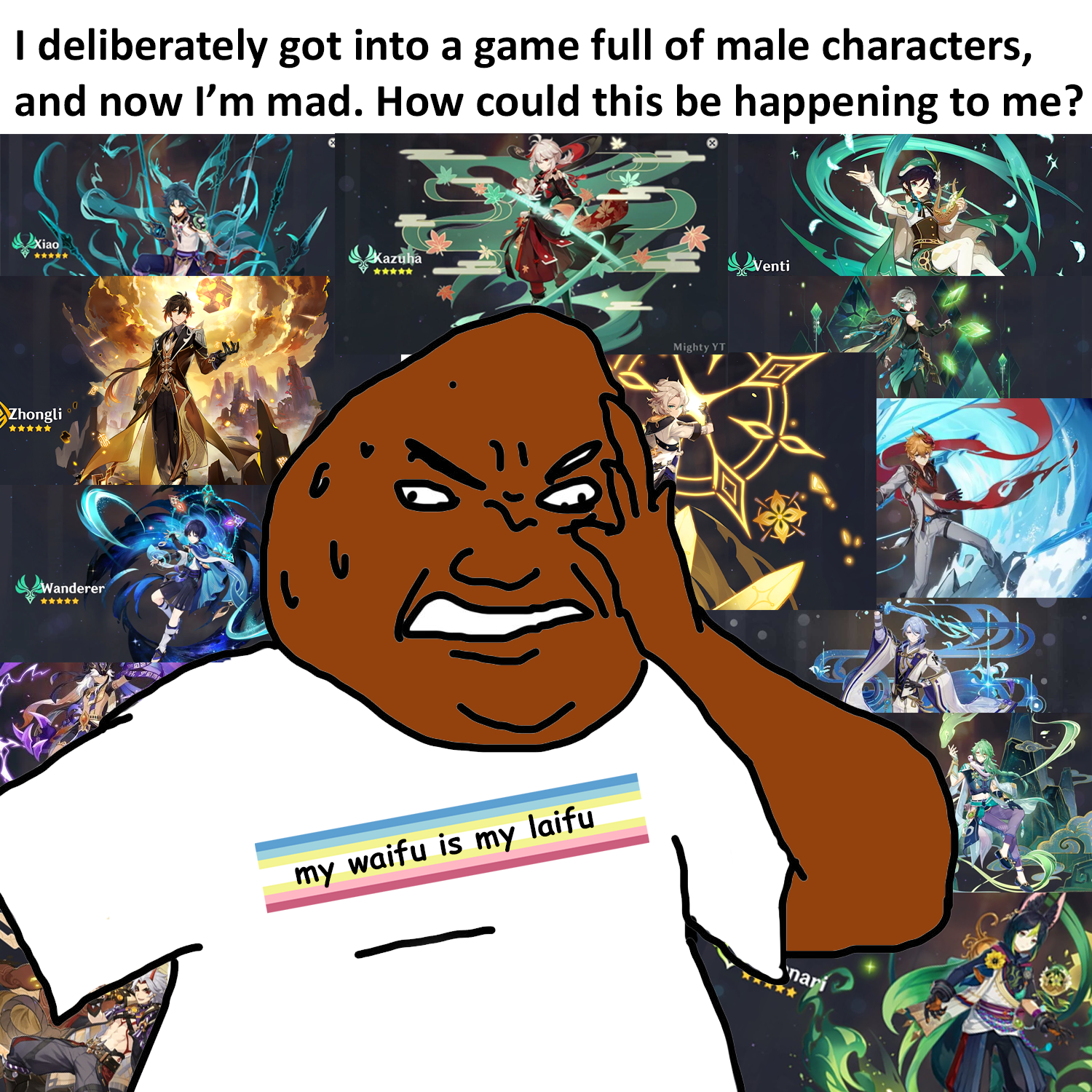 >5 years of hype and glaze>Non combatant cheerleader in his debut region AQ>Mid chink fujo's idea of a manly man design with no armor>Dud expedition with no horses>Cringe EN voiceover>Mid kit barely better than ancient Fontaine DPSs>Gets corny animation as a cope to buff his sales (it won't)>Mogged by his own coworker on his own banner patch>Mogged by a STANDARD character no less on social mediaWhat do we call this specimen from Mondo?