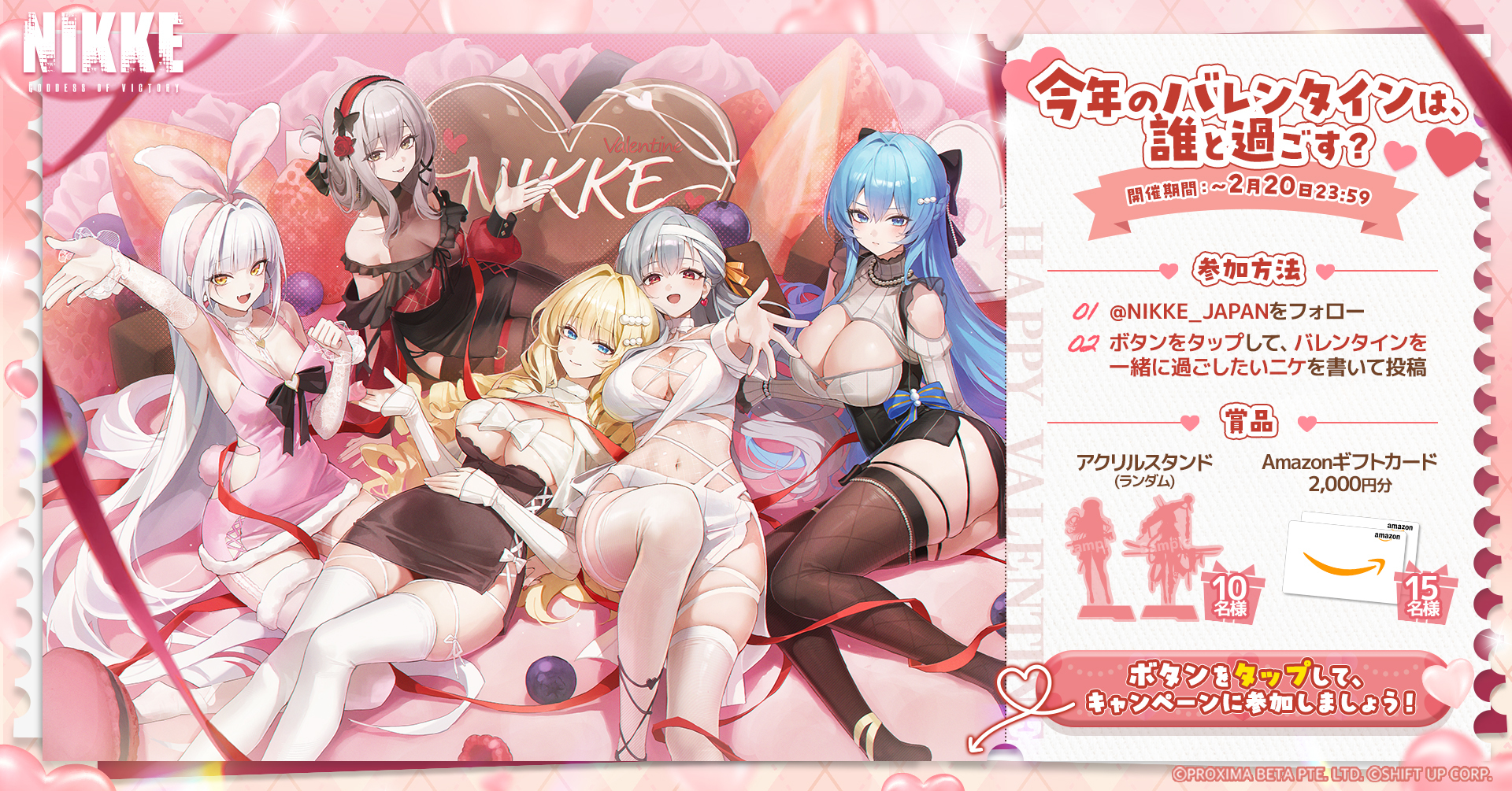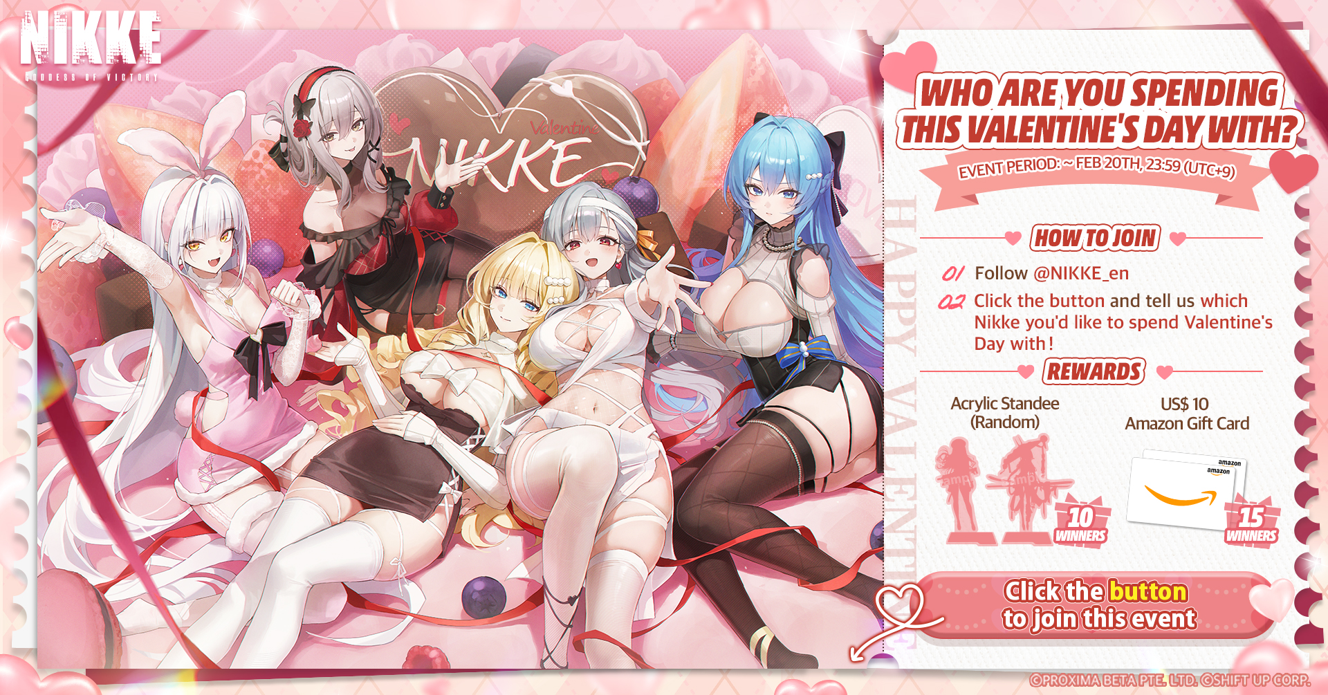 【Who are you spending Valentine’s Day with?】Sweet treats and Nikkes’ love await you this Valentine’s Day.Who will you make special memories with? Click the button below to vote!Join for a chance to win official merch & gift cards.Event ends: ~ Feb 20, 23:59 (UTC+9)