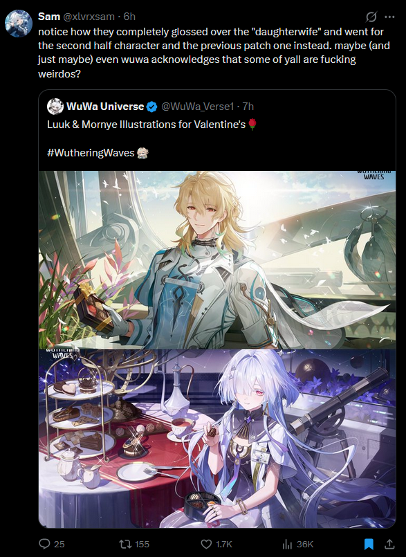 picking mornye instead of Aemeath for valentine art, fucking Kuro had no ball, fuck you, why the fuck did you create a literally wife for a daughter role, could have just picked a hebe model like carte or even encore, now all the famdom just call her daughter and we know she would be ship with another character where everyone just be like, my son in law, or worse, muh dauhter in laww fucking retarded devs