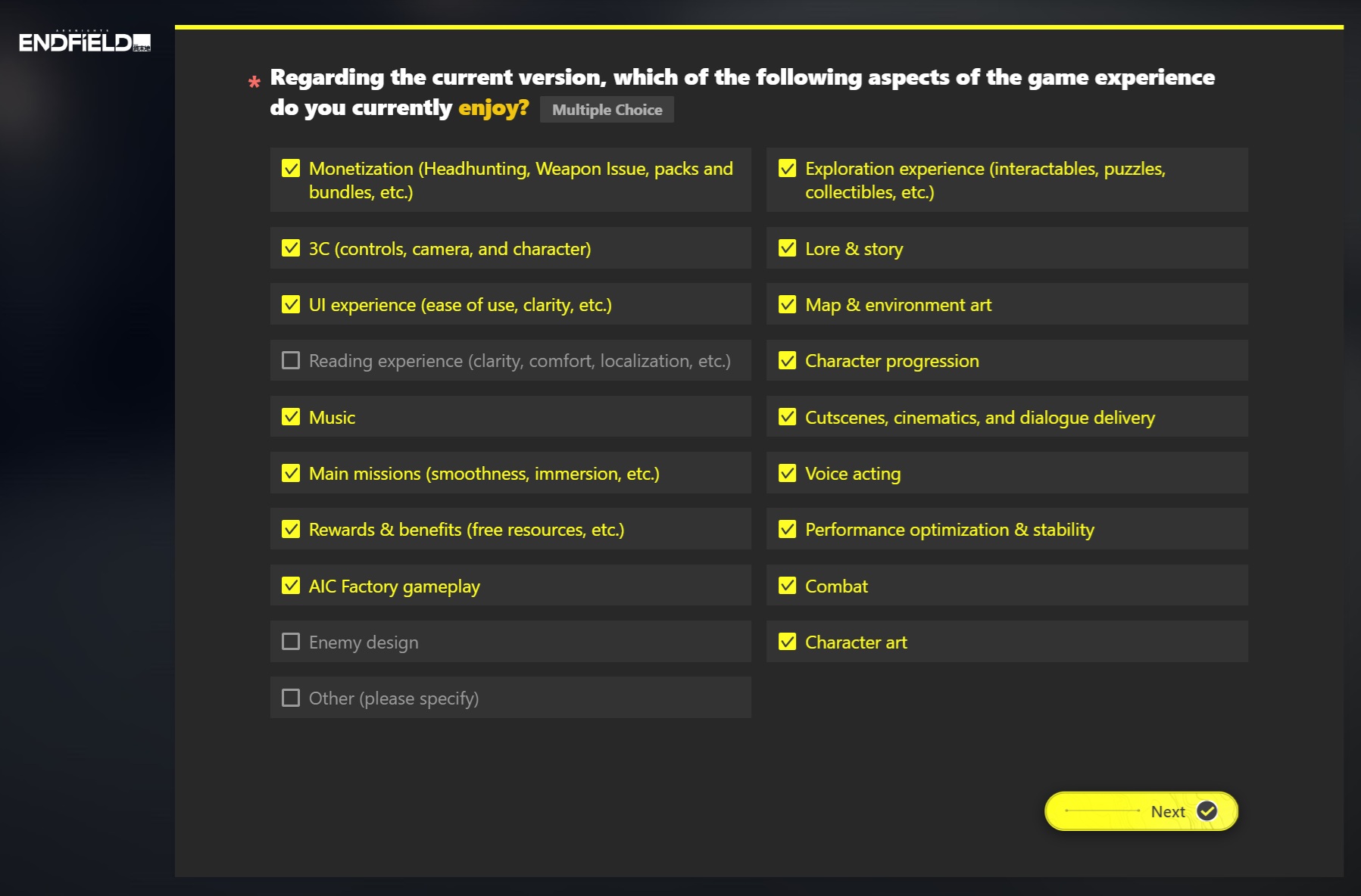 Previous thread: >>557339342>Official Websitehttps://endfield.gryphline.com/en-us>Official EN X (News)https://x.com/AKEndfield>DEV Comm (Developer Updates)https://endfield.gryphline.com/en-us/news/3846>Gilberta PV'shttps://www.youtube.com/watch?v=8hZVxeiSmQ4 - EP [Snap Shot]https://www.youtube.com/watch?v=BQom1V9TdbM - Operator Storyhttps://www.youtube.com/watch?v=h70w5ZmXLkE - Combat Demo>Chartered Headhunting ScheduleFebruary 7th to February 24th --- "The Floaty Messenger", (Gilberta)February 24th to March 13th --- "Hues of Passion", (Yvonne)TBA>Reward CodesENDFIELDGIFTENDFIELD4PC>Twitch Dropshttps://endfield.gryphline.com/special/third-party-binding?channel=twitch>Voyage to the Stars (Ongoing until March 4th)https://endfield.gryphline.com/activity/voyage-to-the-stars/en-us/>Wikishttps://wiki.skport.com/endfield (Official)https://perlica.moehttps://warfarin.wiki/enhttps://endfield.wiki.gg/>Blueprint Guideshttps://talospioneers.com/en>Stickershttps://drive.google.com/drive/folders/13KH3L6QPIKkVH7pBddv4uxwmwJsnOtklhttps://drive.google.com/drive/folders/1OuVtjv1k-9c3M6n7d4PX3CGG5bkwH04ahttps://drive.google.com/drive/folders/1AStB8bzFk3lSwMwczWPkFYCBrZe0vHOghttps://drive.google.com/drive/folders/1yS0lqUhxf8tBRtpDFfCU1y16IS2sSeF7>Fr/end/sSubmit your info, /end/min:https://forms.gle/Fo7BhZMKaKqiWyL19View other /end/mins:https://docs.google.com/spreadsheets/d/1YtxiDss0hgEQhLlZgpfzyGrJrzUcqDzOS9T6IH-BiVc/edit?usp=sharing