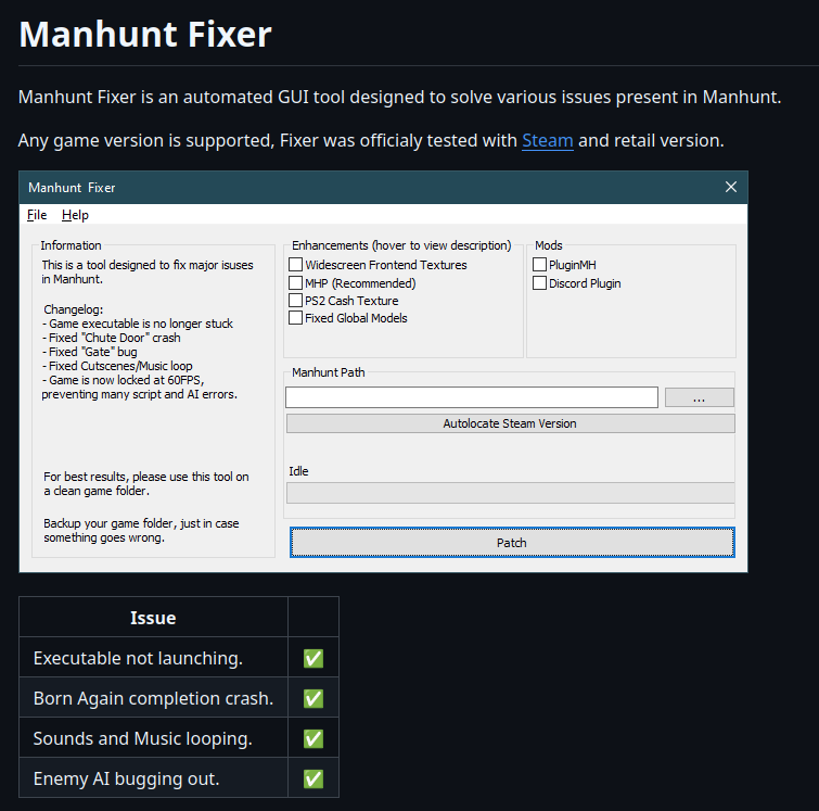 >re-post my post to fix a mistake>pick up extra (You)s from references to my own post because of the copy-paste>have to re-post againI apologize for shitting up the archive but at least 4chan isn't refusing to let me delete my posts today.One more note about Manhunt for >>557448370 >>557475167:I tried and failed to find any other documentation of that latest ProtonDB report's claim that one should run>printf "\x00" | dd of=manhunt.exe bs=1 seek=2270 count=2 conv=notruncafter renaming testapp.exe to manhunt.exe, so I still don't know exactly what effect it has or why I need it. (To be clear, I didn't run that command before the testing done above; I only told Steam to run testapp.exe via launch options.) The report says the command "rewrites the executable so that anti-piracy measures are always disabled" but I thought disabling the anti-piracy was the whole point of renaming testapp.exe (supposedly a cracked pirate copy) to manhunt.exe in the first place, so what the frick.Anyway, running what is supposedly a warez group's cracked executable seems a bit sketchy even if Rockstar thought it was good enough to pass off as their own, and that ProtonDB report's further modification of the cracked executable implies there's something still subtly wrong with it (with no clue what that might be), so I wanted to try another fix.There is a patch which apparently circumvents the anti-piracy measures in the original executable:>https://github.com/Fire-Head/MHNoDRMSo I removed the launch options given in >>557472441 (thus setting the game back to its normal state), downloaded "MHNoDRM.asi" from that GitHub repo, and dropped that file into the game folder. This appears to be working, as it fixes the crash and locked gate at >>557472441 without any need for switching executables, which is nice. And I reckon this patch is at least as trustworthy as a cracked executable distributed by a lazy publisher.