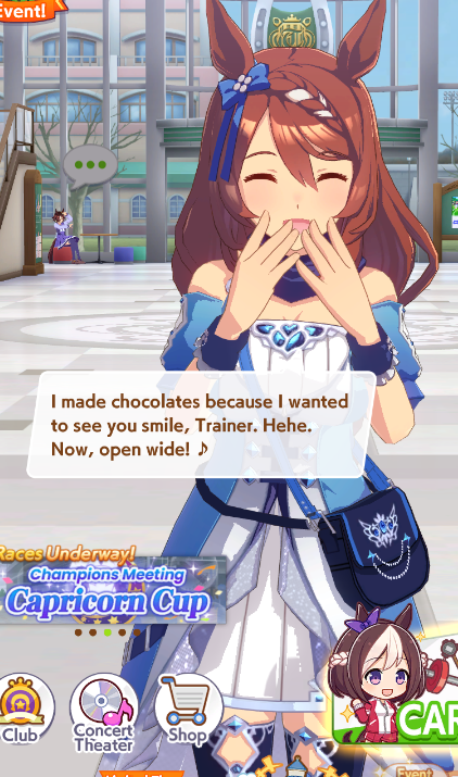 Previous: >>557359864>Global Game NewsLink your account to Cygames iDCurrent Scenario: Aoharu Hai aka "Unity Cup"Current Rate Up Trainee: Sakura Chiyono O (3*)Current Rate Up Support Cards: SSR Sasami Anshinzawa (Pal), SR Tamamo Cross (Guts), SSR Riko Kashimoto (Pal), SSR Tazuna Hayakawa (Pal)Current CM: Capricorn Cup - Chukyo Turf 1200mMain Story Chapter 5 is out01/27 - New Beginnings Part 102/11 - 02/19 - Sakura Chiyono O+Tazuna SSR+Riko SSR Rerun02/13 - 02/19 - Capricorn Cup - Chukyo Turf 1200mhttps://umamusume.com/news/100040/https://pages.snep.pw/uma/anni-skill-changes/>JP Game NewsCurrent Rate Up: Valentine Taiki Shuttle (3*), Valentine Sounds of Earth (3*), SSR Matikanefukukitaru, SSR Neo UniverseNew Scenario "Yukoma Hot Spring" releasedTimeline: https://uma.moe/timelineCygames Webstore: https://webstore.cygames.com/en/umamusume_en/>Thread Clubshttps://rentry.co/umaglobalclublistYou must be E3 (20k points) to join a circle. Apply with /uma/ or /vg/ in your profile or post ID in the thread.>All Guides & Resourceshttps://rentry.org/uma26Game databasehttps://gametora.com/umamusume (Click the gear to switch between JP / global server info)A basic guide for newfagshttps://rentry.org/umaglobalFind networks if your region is blocked from the game or clienthttps://www.umavpn.top/93Seiyuu & Concertshttps://rentry.org/umstUma Texthttps://umareader.idsmile.xyz/