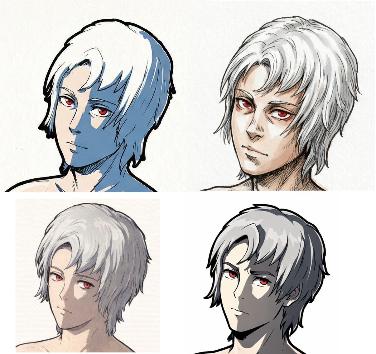 >>557380596Artlet here, please feel free to disregard this post itself.In these images, the thick outer outline basically never goes into the hair, and the thickness of the outer outline never varies:>>557376504>>557380596>>557383564In these images, the reverse tends to hold:>>557201710>>557201903>>557378818>>557377542