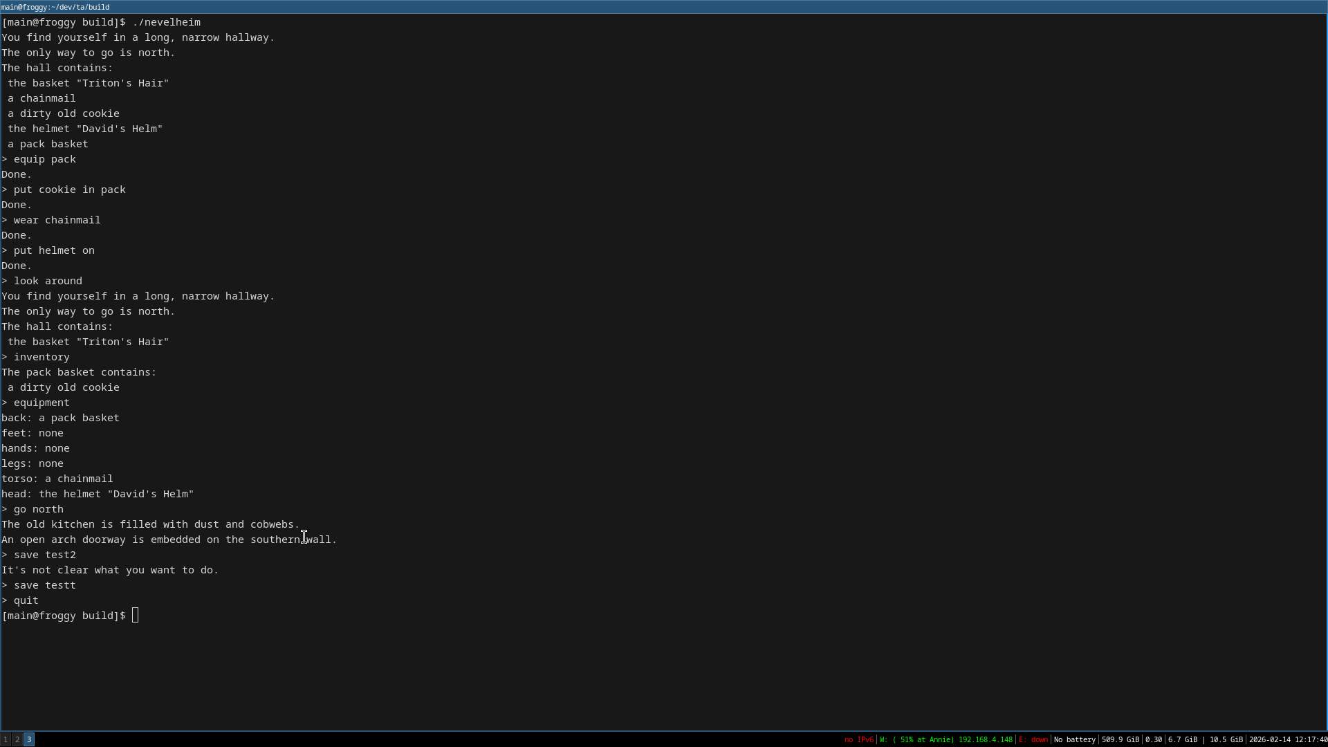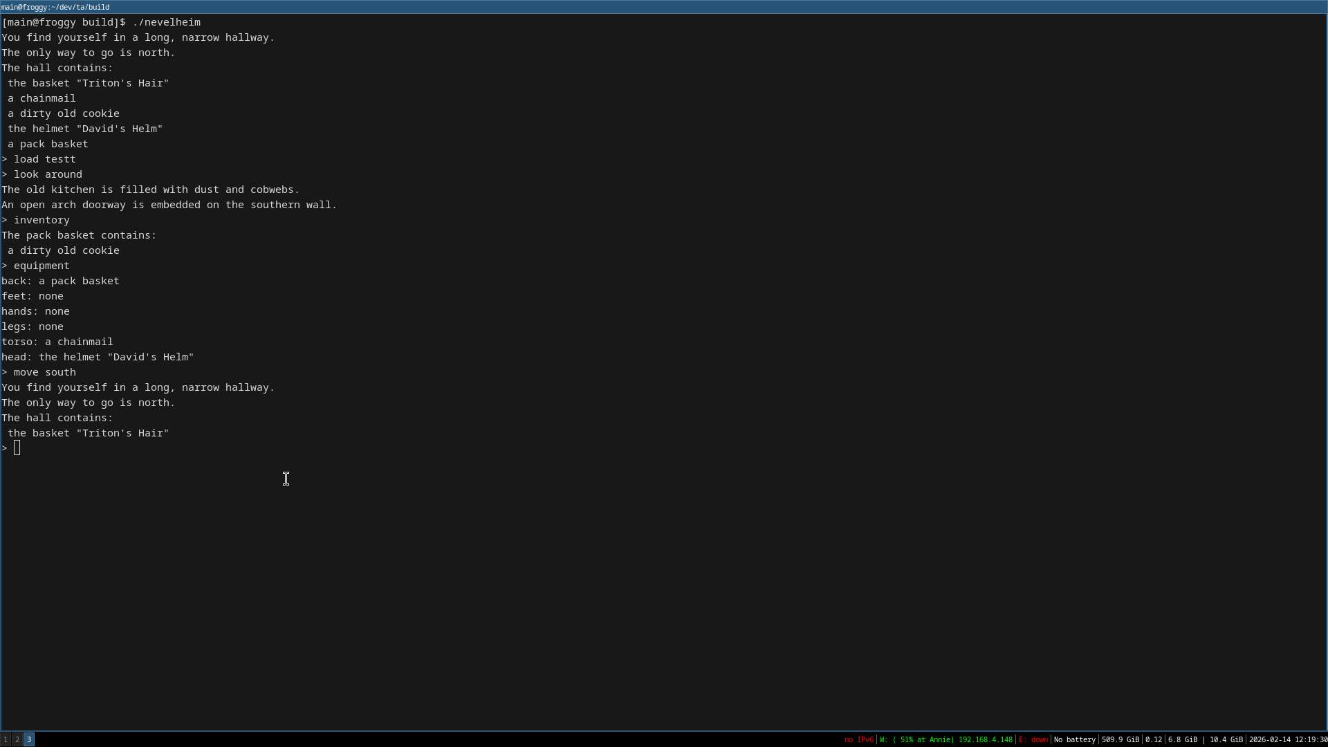 So now that I have serialization working the next step is custom dynamic behavior. Basically having commands change the world depending on specific conditions.The idea is so that I can eventually have things like locked doors and chests, rooms that change (like breaking through a crack in the wall), et cetera. I'll come up with a basic example and see if I can get it done by tomorrow. I have to get ready for work soon.Post dev musichttps://youtu.be/ap87QgZKTNw?si=WbYi4E3iGuVzzv8xhttps://youtu.be/Pb4j2UqkOJ0?si=9wUx4XZNwojHI2Lchttps://youtu.be/7sw3nDbQ4IY?si=wo3x-jffy0SHX0IR