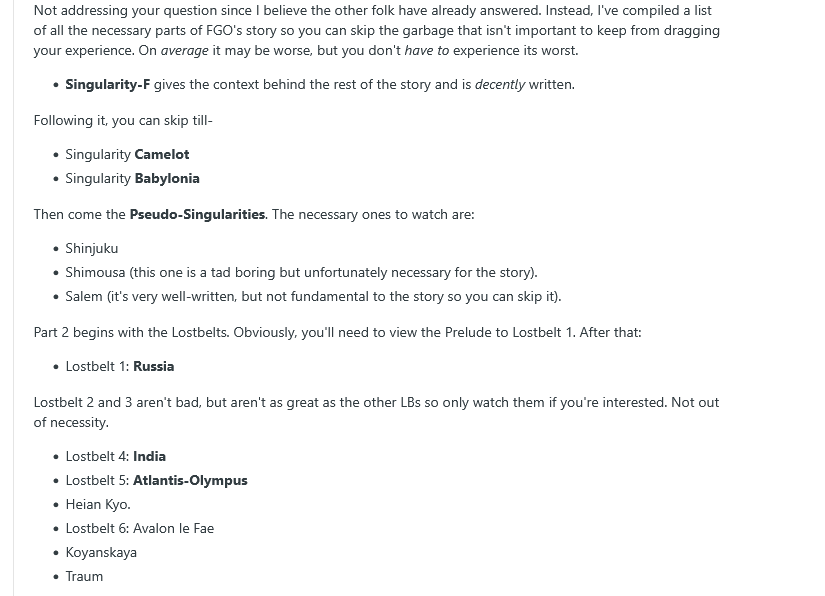 >>557431629The length of everything you're skipping in part 1 is less than the length of a single lostbelt in part 2. It's not particularly great writing but it's at least worth going through for the characters it introduces, some of which reoccur in events and story.Also for some reason that image doesn't say to read the Solomon chapter, which is absurd. Even if I were to recommend skipping anything I would not recommend skipping Solomon at all.My honest advice is just read it. Recognise that the first few chapters existed back when the game was smaller, and are vehicles to deliver characters, and it shouldn't offend you.