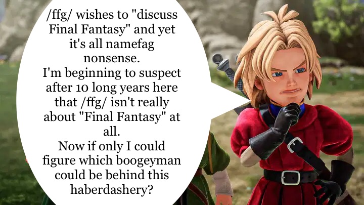Remember that you can dislike stuff without making it part of your personality. Report and ignore shitposters that only spam and argue in bad faith./ffg/ spam filter: https://pastebin.com/SJ1sb9r0>General Info on Final Fantasyhttps://finalfantasy.fandom.com>What version should I play?http://pastebin.com/nDC7j5bn>Final Fantasy Pixel Remaster Trailerhttps://www.youtube.com/watch?v=XdLsIQEGj-E>Final Fantasy Tactics: The Ivalice Chronicleshttps://youtu.be/JRIElEOQa4c>Final Fantasy XVI Infohttps://na.finalfantasyxvi.com>Launch Trailer "Salvation"https://youtu.be/_CrV3hkJuvs>DLChttps://youtu.be/RecsFD6SWfchttps://youtu.be/aveDvd66clk>PC Trailerhttps://youtu.be/LBqpFlA_4Is>Final Fantasy VII Rebirthhttps://youtu.be/WgdkN2tCAFwhttps://youtu.be/Q56cRDseTGQ>Dissidia Duelum Final Fantasyhttps://youtu.be/zLM7V3jrNNc>Final Fantasy VII Ever Crisis>>>/vmg/1916155>Dissidia Final Fantasy Opera Omniahttps://www.youtube.com/@DFFOperaOmnia>Final Fantasy Brave Exvius: War of the Visionshttps://pastebin.com/1yvynbW8>Final Fantasy XIhttp://www.playonline.com/ff11us/index.shtmlPrevious thread: >>556930440