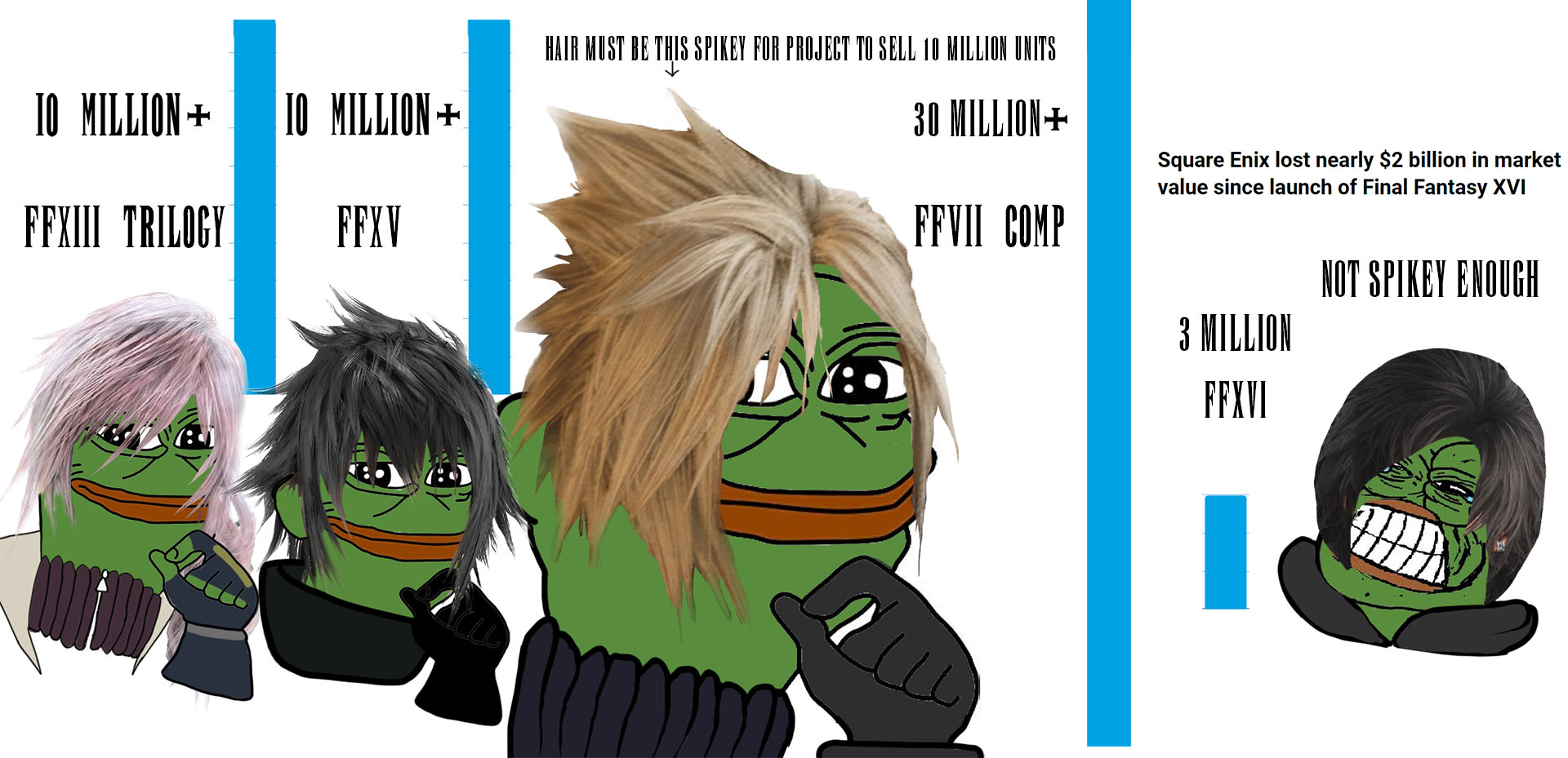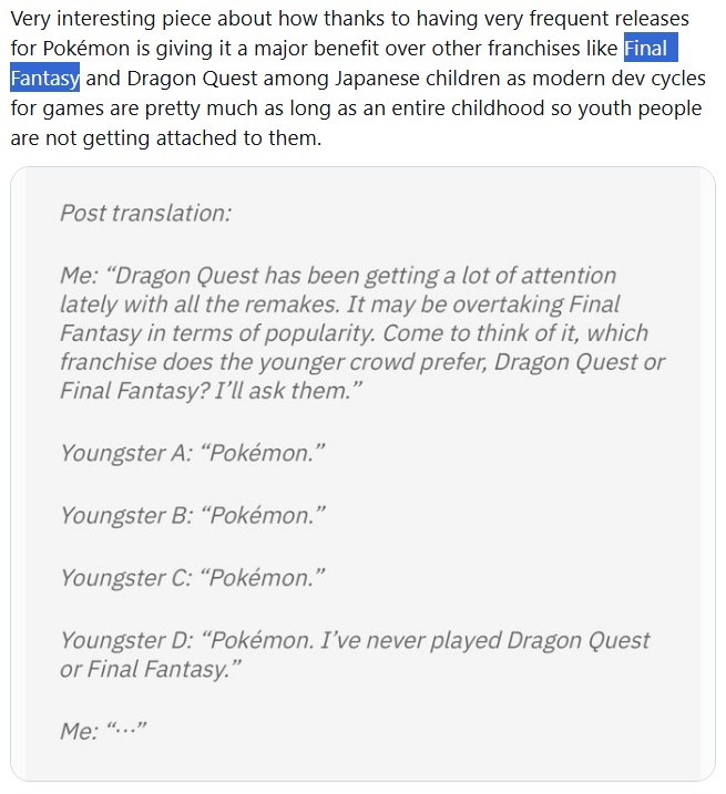 It's a sad truth: Final Fantasy just isn't as popular anymore.Kids want games now. You can't tell them, "Here's one title at age 7, now wait for the sequel at 14." By then, their childhood is practically over. And yeah, this is exactly why Pokemon stays relevant: near yearly releases.https://automaton-media.com/en/news/young-gamers-in-japan-may-not-be-forming-the-same-attachment-to-final-fantasy-or-dragon-quest-because-modern-dev-cycles-are-as-long-as-their-childhood-users-theorize/