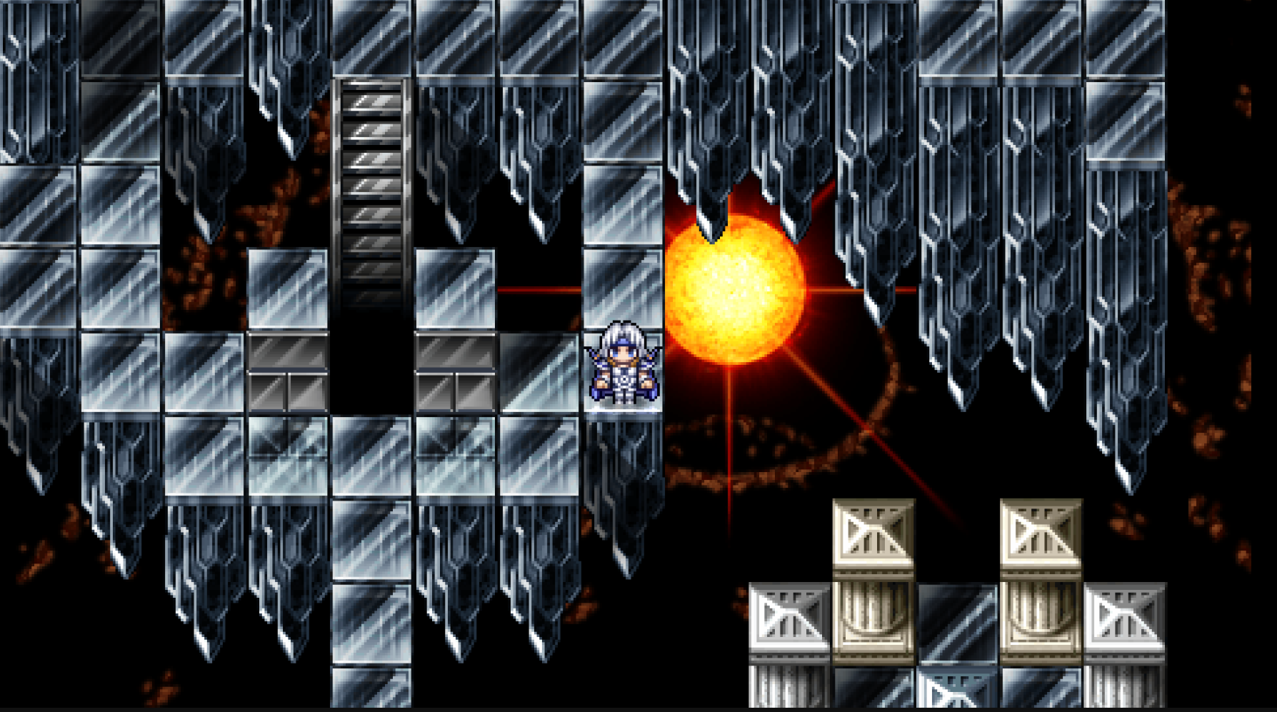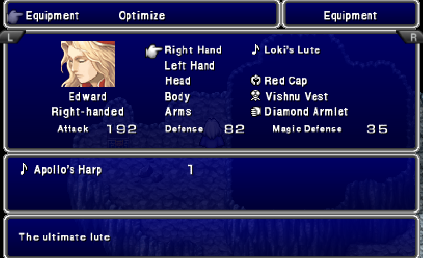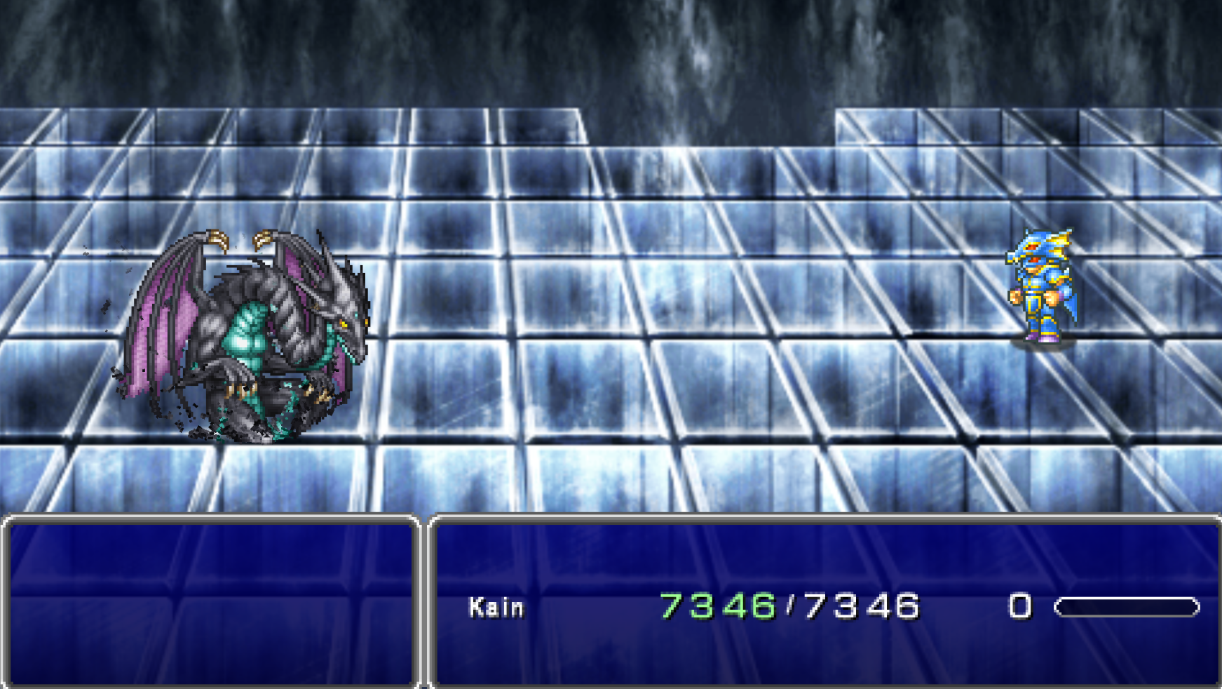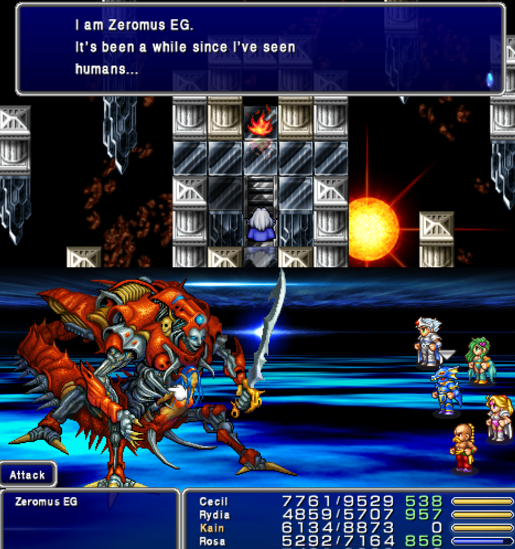 Oh yea I forgot to mention this the other day.Basically, this is the ACTUAL superboss of the game. There's Zeromus EG at the end of this dungeon, but that's a pushover.THIS ASSHOLE ON THE OTHER HAND, its entirely 100% optional. he has its own floor, you are told to NOT approach him, and you can indeed ignore him continue on as normally.IF YOU DO APPROACH HIM, it starts the most bullshit fight in the whole game.It's gimmick is that he has 3 modes.Physical, Megaflare, and ((((MAGIC))))Physical is the easiest one, for besides one instakill spell, all he does is random attacks. You can tank those easy enough.Megaflare is also "doable", just a countdown, and when it finishes, he nukes the entire party. If you don't reflect, he wipes you. If you reflect, you do 9999 damage. Simple, right?WRONGFor if you DARE TO ATTACK HIM, IN ANY WAY, during the countdown, he will start the magic phase.He will apply on himself shield and reflect, and start spamming 3 "delta spells" per turn, each enough to nuke one char each. And this phase will take a looooong ass time. Or at least it feels so, with all the healing and reviving you'll have to do.You really, REALLY, don't want him to enter this phase.The reward it's pretty neat, tho. A shield that everyone can use, and that absorbs all elemental magic. ... Not that you will need it after this. Unless you wanna farm this boss over and over to give a shield to the entire cast.