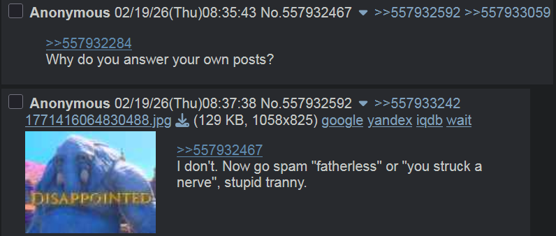 >>557918256It always does that when the question hits too close. Like the $cientology do.Funny coincidence that a fatherless cultist acts like cultists.