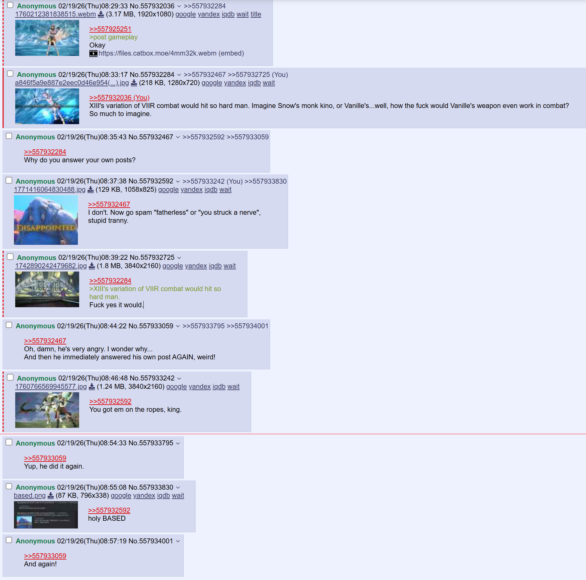 >>557929098dont talk about what OP doesnt want you to talk about and especially dont criticize final fantasy 13 otherwise he'll put on his 4chan pass image spammer and spam for an hour.