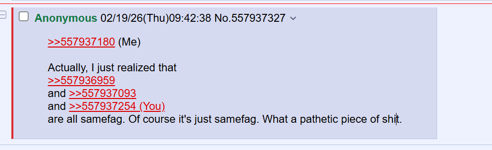 >>557937180 (Me)Actually, I just realized that >>557936959and >>557937093and >>557937254are all samefag. Of course it's just samefag. What a pathetic piece of shit.