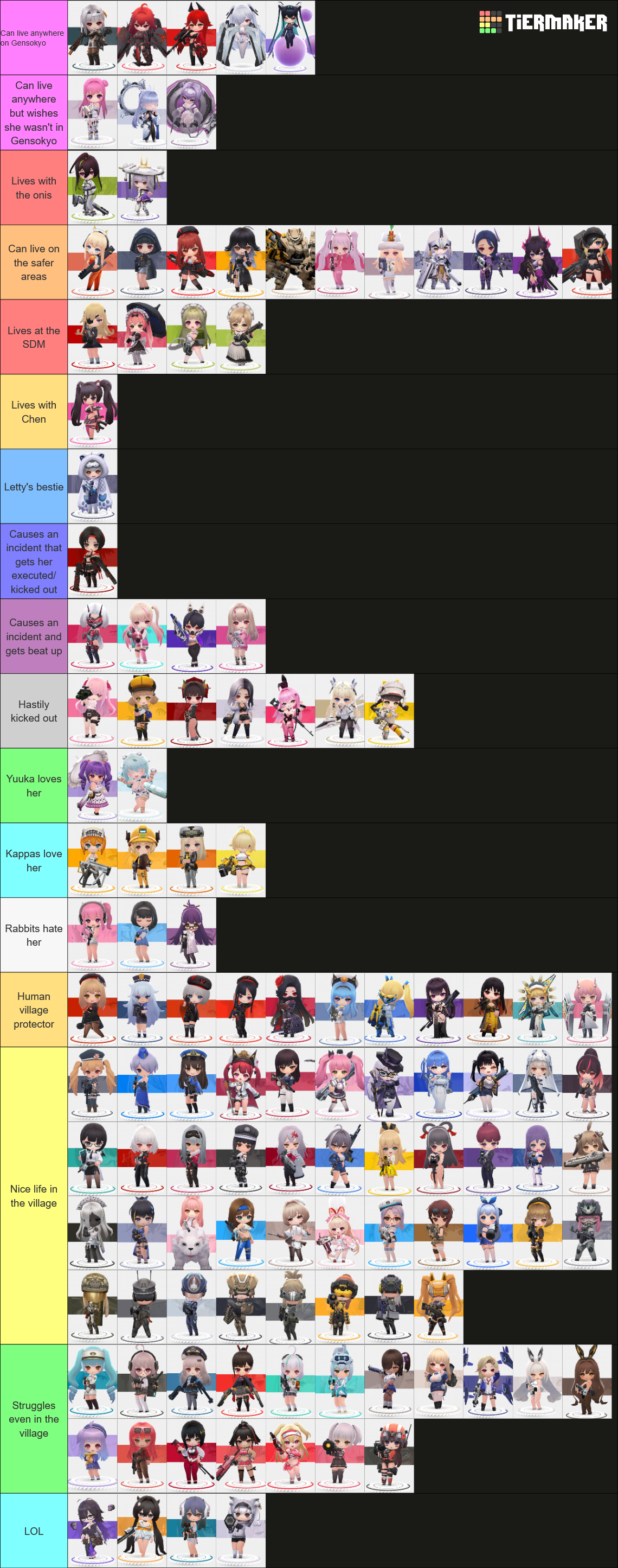 >>557461930Putting nikkers in Touhou is just kind of a weird concept because they don't mesh that well with the setting. They're mildly superhuman but Gensokyo is pretty much all about flying and having magical powers. But then their high caliber anti-Rapture weaponry could actually pose a threat to your standard youkai and their existence in Gensokyo could be enough of a potential balance upset that one of Gensokyo's heavy hitters might just wipe them all out personally to avoid the potential problems.All that being said I feel like most nikke would probably just make homes for themselves in the human village. More anti-social nikke might seclude themselves in adjacent areas like the forest of magic but realistically I don't see any of them wanting or needing to venture further into youkai territory. Even the human hating nikke, i.e. the heretics, would have surprisingly little in common with youkai. Honestly I think the most interesting thing that could come from this conceptually is narrowing down which nikke wouldA) Have the talent and dedication to pick up magic.B) Would be comfortable enough with Gensokyo's status quo to take it upon themselves to preserve it.C) Take an interest in resolving incidents.I think the idea of Laplace flying around firing lasers at "evil doers" is fun, even if Marisa would get annoyed (hypocritically) at someone taking her "laser" gimmick from her.