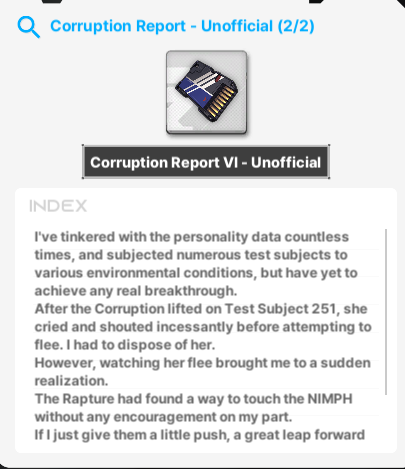 >>557464508Mirror is the corruption code. Red Shoes made her by planting her personality data into the proto code.