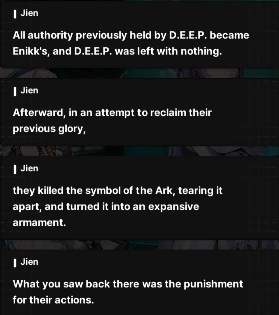 >>557486061It never says that Enikk was in charge of DEEP. DEEP were nikkes working for the VTC and Enikk was in charge of the entire Ark. Enikk only clears them out when they start causing trouble for the Ark and that's after the central government already coup'd the VTC. It's never really said how Enikk subjugated DEEP. For all anyone knows she order an army of nikkes to come in and start shooting, but it could have happened in other ways.