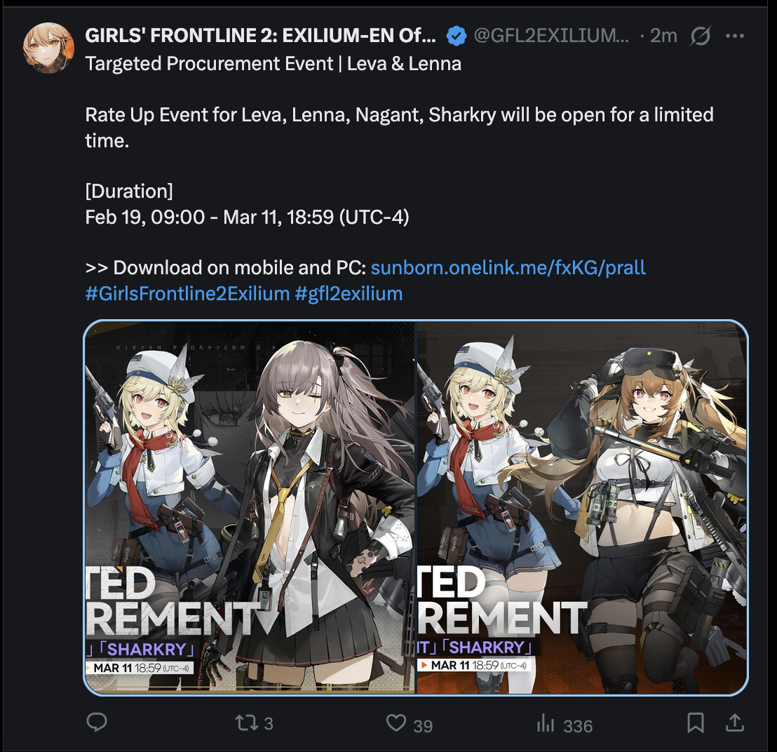This is a thread for Girls' Frontline 2: Exilium, refer to /gfg/ for other MICA/Sunborn games.>DARKWINTER SERVERhttps://gf2exilium.sunborngame.com/mainhttps://store.steampowered.com/app/3347400/GIRLS_FRONTLINE_2_EXILIUM/>HAOPLAY SERVERhttps://gf2.haoplay.com/en/https://store.steampowered.com/app/3308670/GIRLS_FRONTLINE_2_EXILIUM/>CURRENT/UPCOMING BANNERS AND EVENTShttps://pastebin.com/WReMZrek>RESOURCE COMPILATION (GUIDES, STORY, STICKERS, MODDING, ETC.)https://pastebin.com/xeYHpwtN>PLATOONS LISThttps://docs.google.com/spreadsheets/d/1hK9OFgo7MS-ONpvoek2H7UU5CaKq3lu5G2yqDPH5qtE>DO NOT REDEEMW7G6C9KNK9 (Exp. Feb. 15)3F2D5ULVWU (Exp. Feb. 15)KTDXF8QE6J (Exp. Feb. 15)Previous Thread: >>557243774