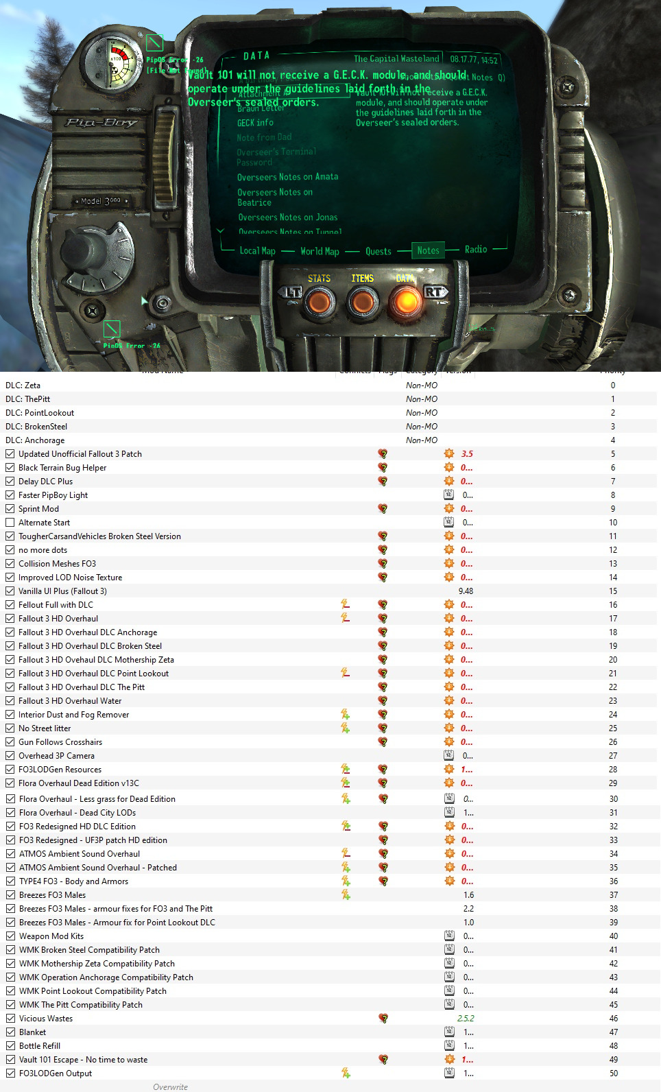 Any idea what could be causing this error when opening a note in Fallout 3?I've tried disabled UI mods that could conflict with no luck, and also cleanted the Data/menus folder from the game folder and I can't seem to fix it.