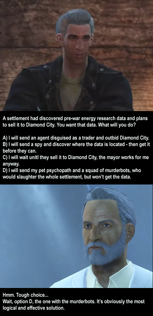 >>557491572>Enclave should treat the wasteland how the CIA treats central america and the middle eastDidn't know how much I wanted that. Makes most of Fallout feel really dumb in hindsight.