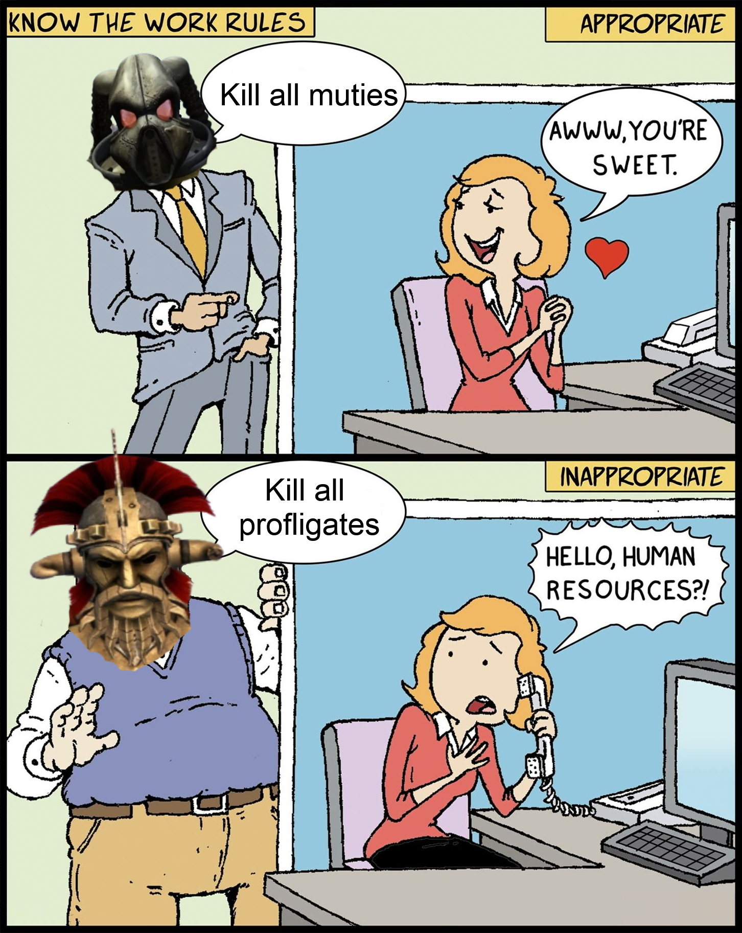 >>557519629>kill all mutiesnah, let the good ones live and be useful>kill all raidersbased>kill all who don't serve the statenever go full retard